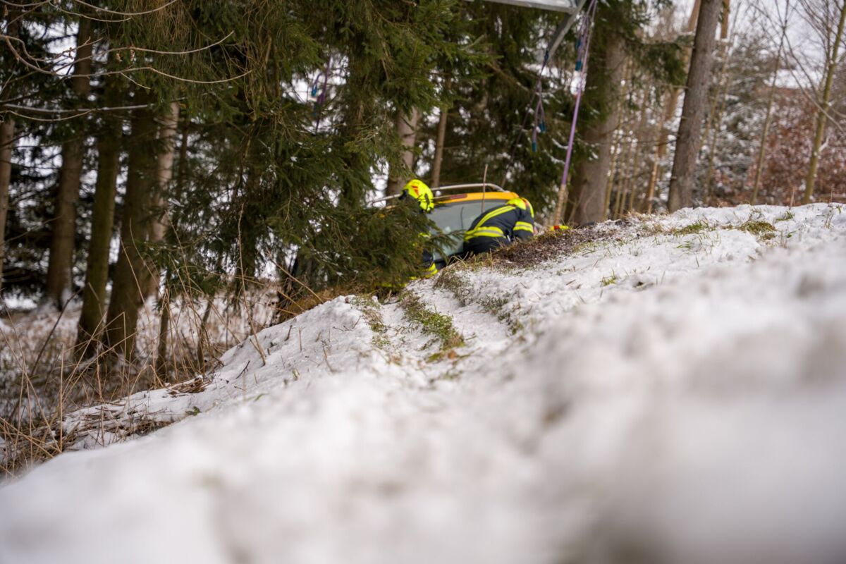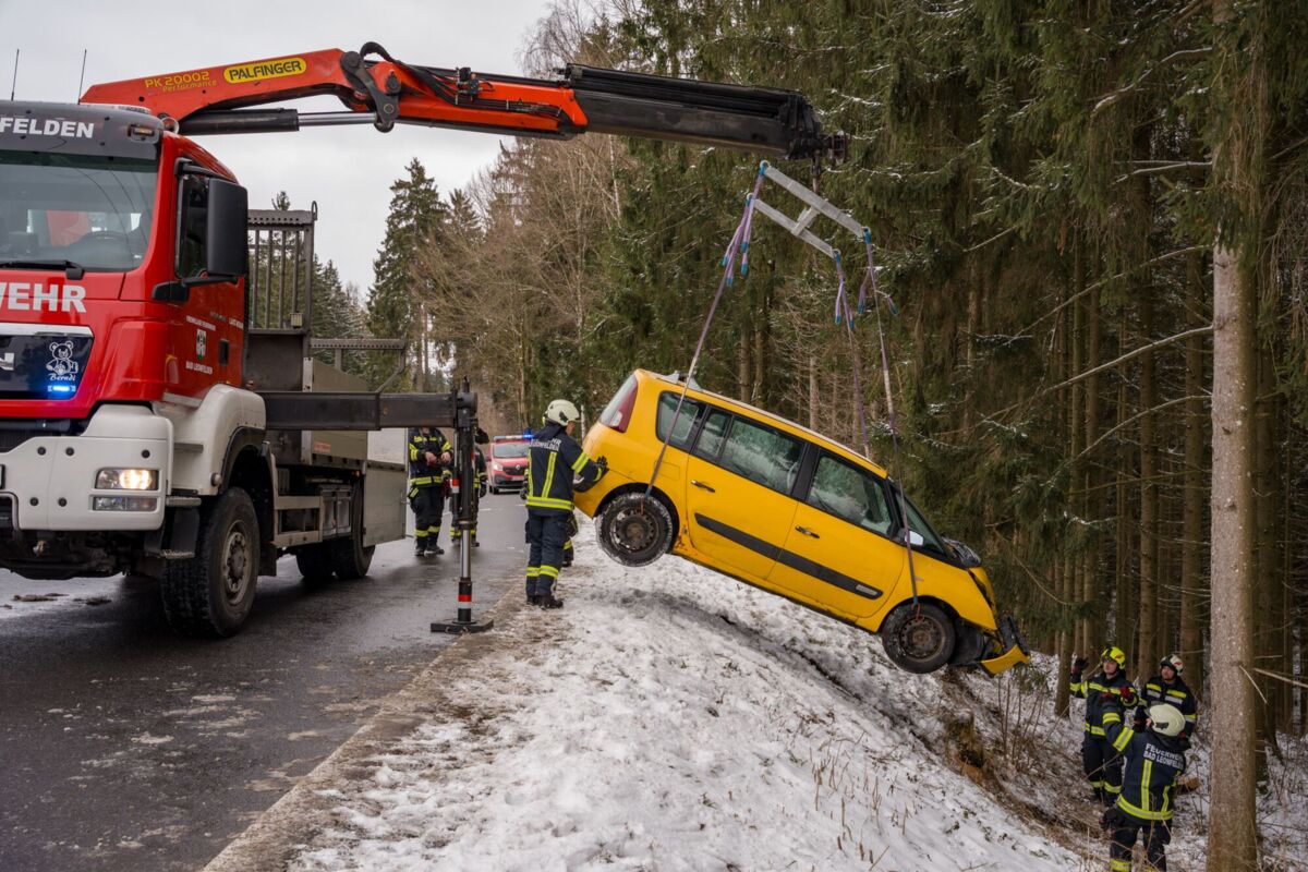 Für die Bergung des Unfallfahrzeugs wurde der Kran der Feuerwehr Bad Leonfelden nachalarmiert. Das Fahrzeug wurde aus dem Wald geborgen und anschließend dem Abschleppdienst übergeben.
