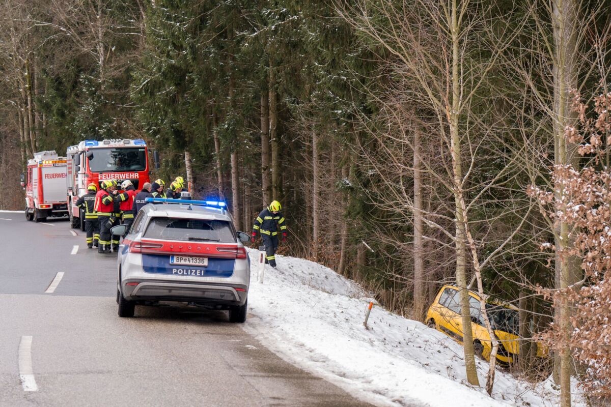 Ein Fahrzeuglenker verlor aus bislang unbekannter Ursache die Kontrolle über sein Fahrzeug und kam von der Fahrbahn ab. In weiterer Folge stürzte das Auto über eine Böschung in den angrenzenden Wald und prallte dort gegen einen Baum.