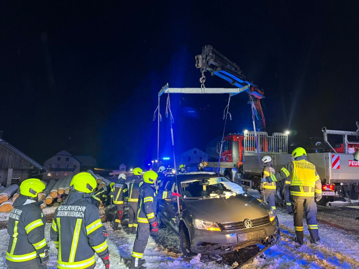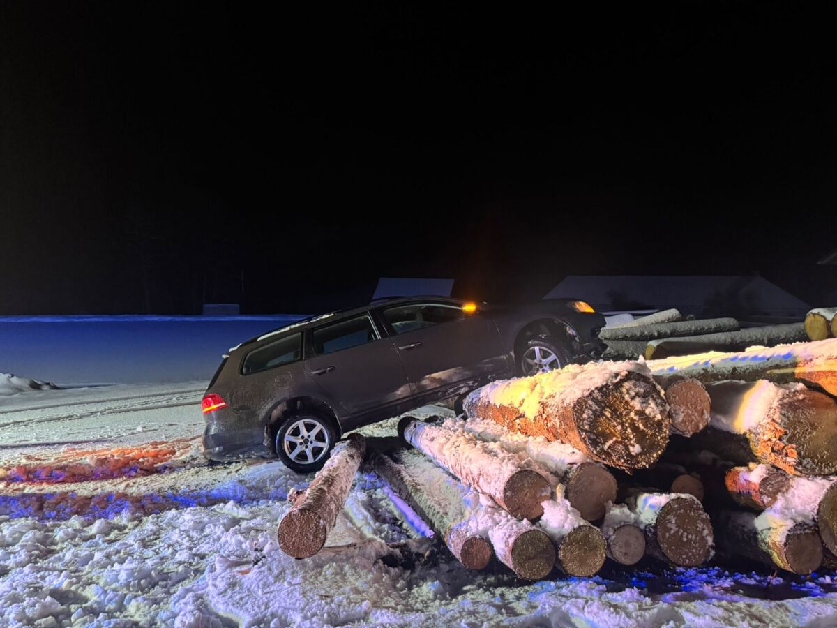 Montagabend gegen 18.30 Uhr wurde die Freiwillige Feuerwehr Vorderweißenbach zu einer Pkw-Bergung alarmiert. Ein Fahrzeug war auf der schneeglatten Straße von der Fahrbahn abgekommen und in einen neben der Straße gelagerten Holzstapel geprallt.