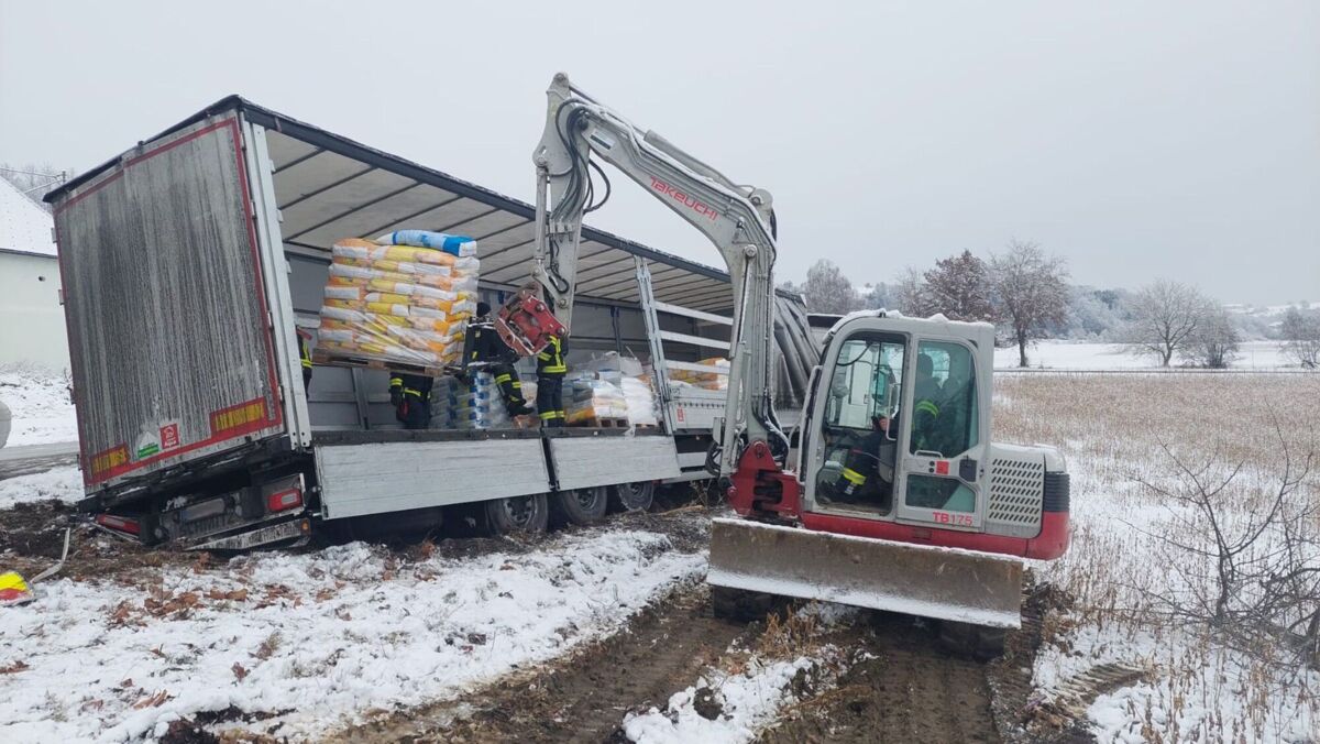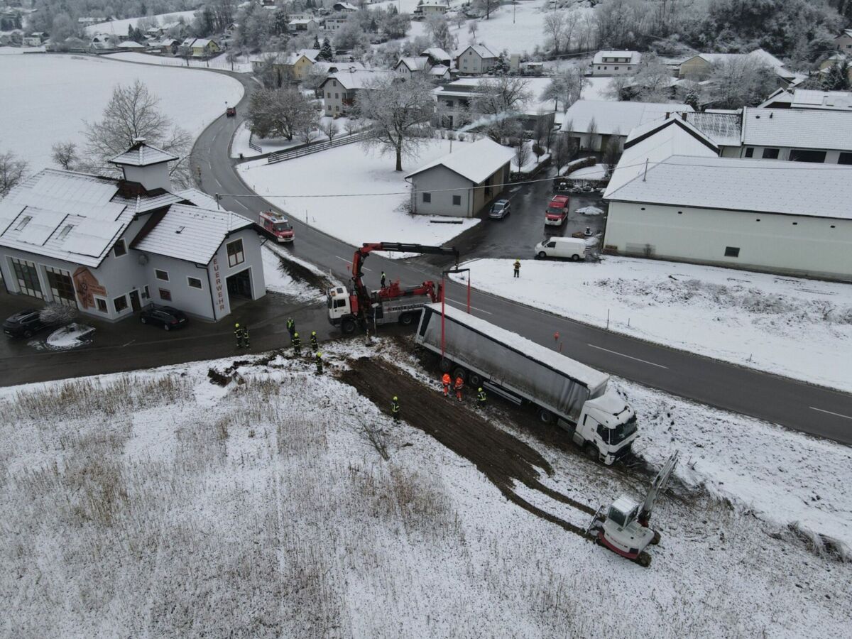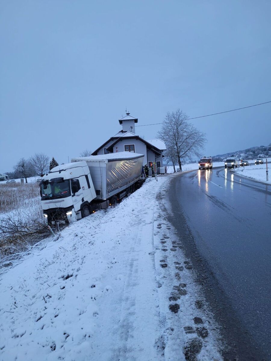 FELDKIRCHEN AN DER DONAU. Bei winterlichen Fahrverhältnissen kam am Freitag ein Lkw‑Sattelzug auf der Aschacher Bundesstraße (B131) von der Fahrbahn ab.