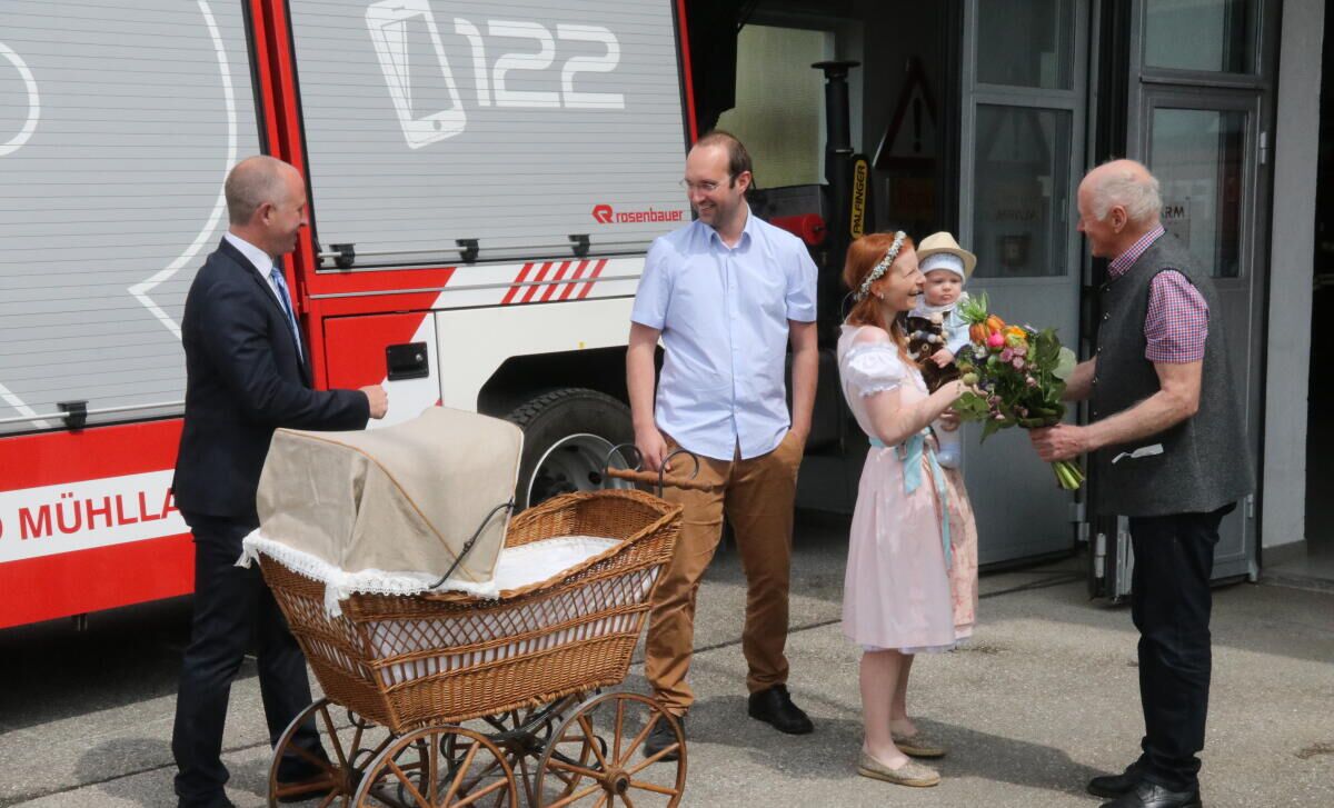Die jungen Eltern Max, Trainer der Jugendgruppe der FF Bad Mühllacken, welche 2019 in der Schweiz Weltmeister wurden, und Elisa, begeisterte Feuerwehrfrau und Schriftführerin sind beide sehr stolz auf ihren Nachwuchs und zuversichtlich, dass der junge Leo die Familientradition als Mitglied der Freiwilligen Feuerwehr Bad Mühllacken in vierter Generation weiterführen wird. Nach der erfolgten Taufe fuhren die stolzen Kindeseltern mit ihrem Sprössling vom Feuerwehrhaus Bad Mühllacken mit dem 135 Jahre alten Kinderwagen zum Elternhaus auf den Sechterberg.