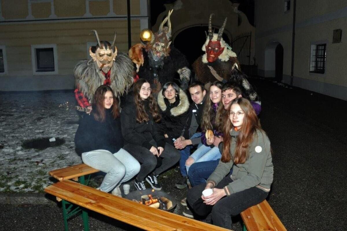 Der Innenhof der Schule erstrahlte in adventlicher Dekoration und bei Punsch, Keksen und auch herzhaften Leberkäsesemmeln entstand schnell lustige und gemütliche Stimmung. Etwas lauter und stürmischer wurde es, als die Aschacher Donaufürsten in voller Montur in Aktion traten.