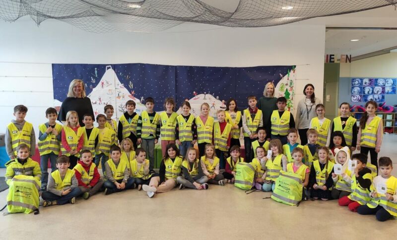 Aber das ist nicht überall so. In die Volksschule Engerwitzdorf-Mittertreffling kommen jeden Morgen nahezu alle Kinder der ersten und zweiten Klassen und auch noch viele der älteren Kinder in den dritten und vierten Klassen mit Warnweste und reflektierender Schultaschenschutzhülle, zur Verfügung gestellt vom Elternverein, zur Schule. Es gibt hier nämlich eine Warnwestenaktion: Die Kinder erhalten für jeden „Warnwesten-Tag“ einen Stempel in ihren Warnwestenpass und am Ende jeden Monats gibt es für jeden vollen Pass eine kleine Belohnung, organisiert vom Elternverein.