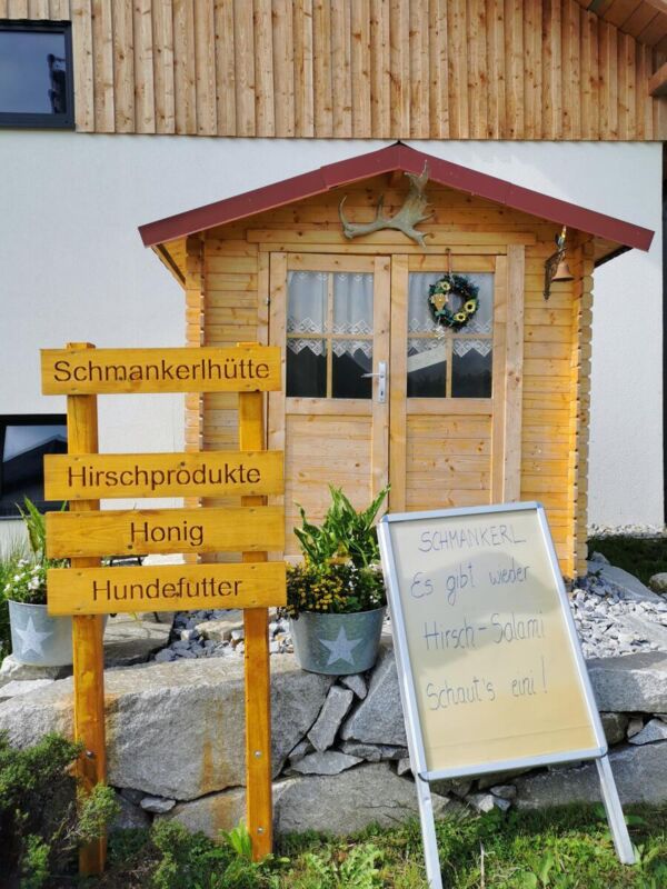 Bei den Kunden hoch im Kurs steht die „24 h-Selbstbedienungshütte“. Hier gibt es die breite Palette vom hofeigenen Wild: Würste, Schinken, Tiefgekühltes vom Hendl und Hirsch und auch Honig.