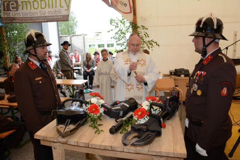 Bei einem Festzug mit Abordnungen von den umliegenden Feuerwehren und Ehrendienstgradträger wurde vom Parkplatz der Neuen Mittelschule zum Festzelt maschiert. Nach der Feier einer Heilinge Messe, zelebriert von Pater Wolfgang Haudum wurde das neue Akku Rettungsgerät bestehend aus Spreizer, Schere und Rettungszylinder gesegnet.