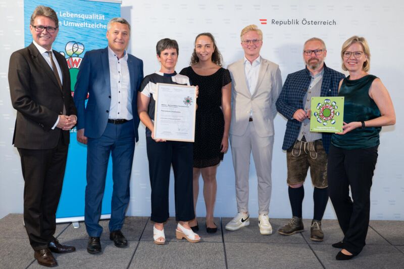 Eine Delegation der Schule konnte deshalb zum zweiten Mal das Umweltzeichen in Empfang nehmen. In Wien überreichten Klimaschutz-Ministerin Leonore Gewessler und Bildungs-Minister Martin Polaschek die Urkunden.