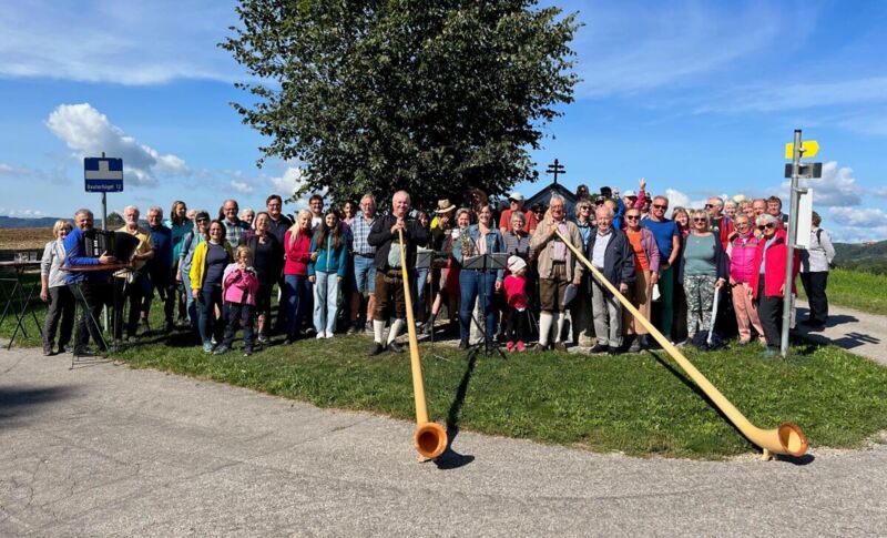 So sind heuer rund 70 Personen bei herrlichem Herbstwetter losgegangen. Von Gotthard Wagner und seiner Sunnseiten Musik begleitet ging es von Lacken hinauf zum Waidhügel, dem höchsten Punkt der Gemeinde Feldkirchen mit 521 Meter, von dort zur schiefen Kapelle, wo sie von einem weit hörbaren Alphorn Trio empfangen wurden. Nach kurzer Rast und gut versorgt von Fred Kugler ging es hinunter zur Wurzinger Kapelle. Dort hat Erich Wurzinger über die Geschichte der sieben Kapellen und über den wunderbaren Ausblick ins Eferdinger Becken erzählt. Den Abschluss mit der Einladung der Gemeinde zu einer kleinen Stärkung fand der schöne Wandertag beim Wirt in Pesenbach.