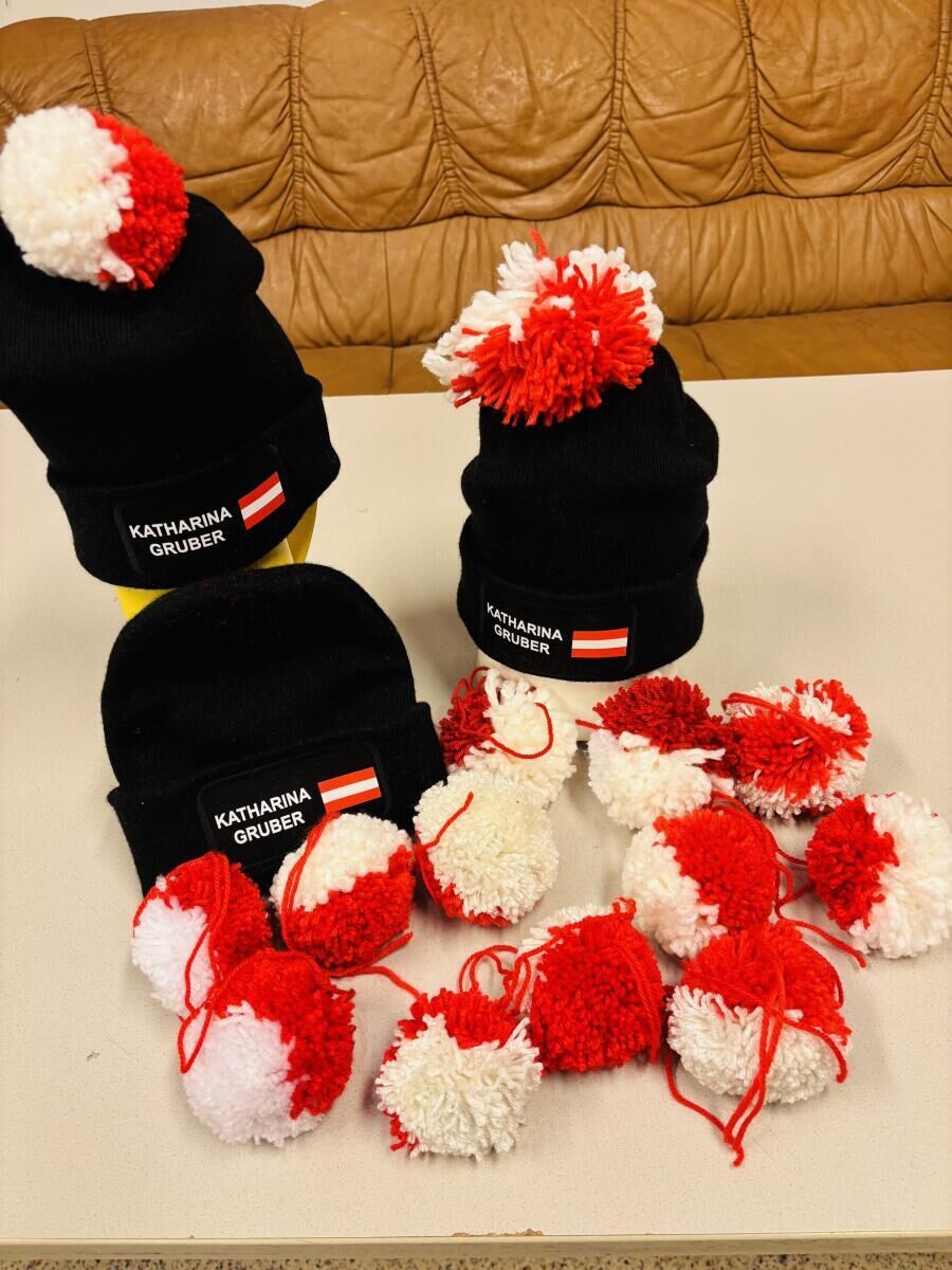 Die gesellige Strickrunde strickte über 30 Paar grüne Socken für ein Sozialprojekt. Für die Kombiniererin Kathi Gruber gestaltete der Fanclub Mützen.