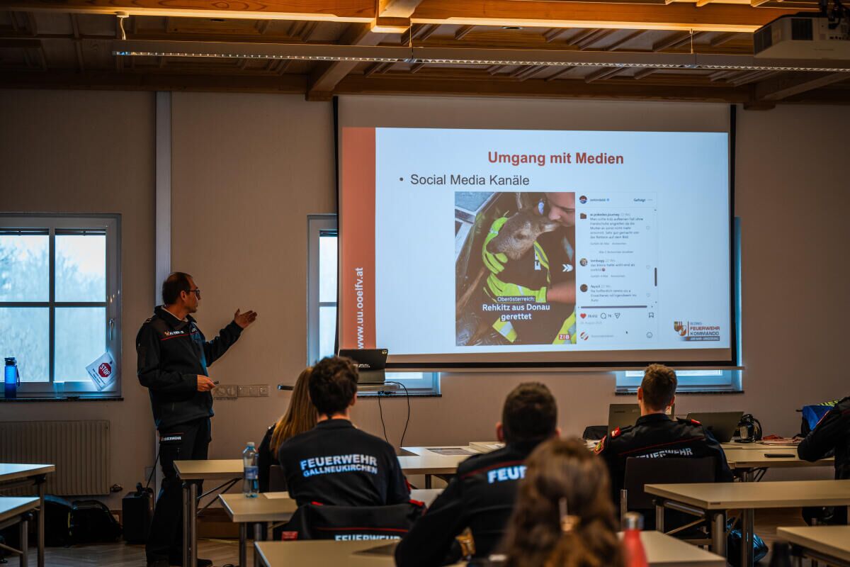 In der Bezirksfeuerwehrschule in der Bauakademie Lachstatt standen aktuelle Entwicklungen und Herausforderungen der Öffentlichkeitsarbeit im Feuerwehrwesen am Programm. Die Verantwortlichen des Bezirks Urfahr-Umgebung – Bezirksfachbeauftragter Phillip Prokesch gemeinsam mit seinen beiden Abschnittsfachbeauftragten Thomas Traxler und Tobias Schartner – erläuterten den Teilnehmern die zentralen Aufgaben moderner Medienarbeit, von der professionellen Berichterstattung über Einsätze bis hin zum souveränen Umgang mit sozialen Medien. Ein praxisnahes Interviewtraining bot zusätzlich die Möglichkeit, das Auftreten vor Kamera und Mikrofon realitätsnah zu üben.