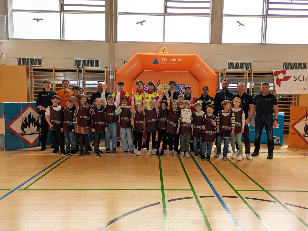 Nach einem spannenden Vormittag in Feldkirchen schlug für die 3a der VS Puchenau die Stunde der Sieger. Platz zwei und drei gingen an die 4a und 4c der VS Feldkirchen. Mit den Kindern freuten sich bei der Siegerehrung auch Bgm. David Allerstorfer und die Vertreter der Einsatzorganisationen.