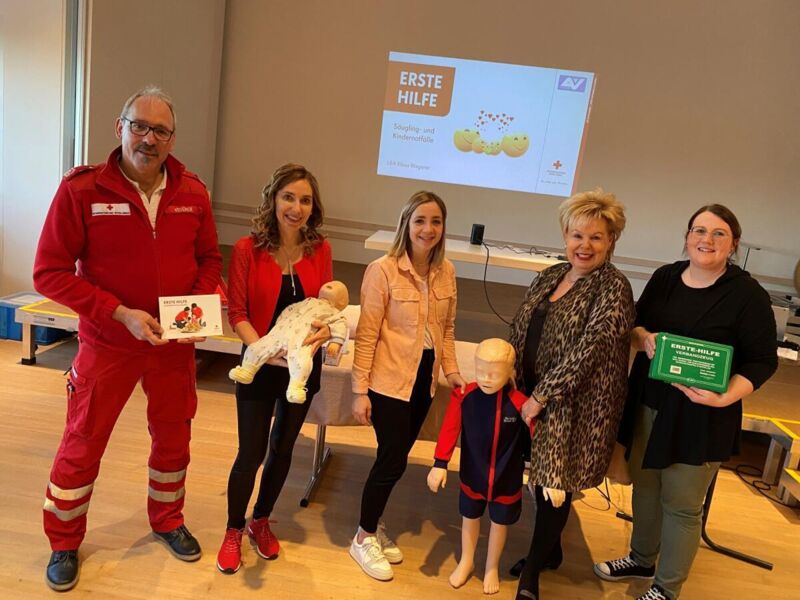 Den Teilnehmer/innen wurde dabei von einem Mitarbeiter des Roten Kreuz gezeigt, wie man bei hohem Fieber, einem Sturz, einer Schnittwunde, einer Verbrennung oder etwa beim Verschlucken eines Putzmittels richtig reagiert. Auch die stabile Seitenlage und die Reanimation bei einem Baby und einem Kleinkind wurde geübt.