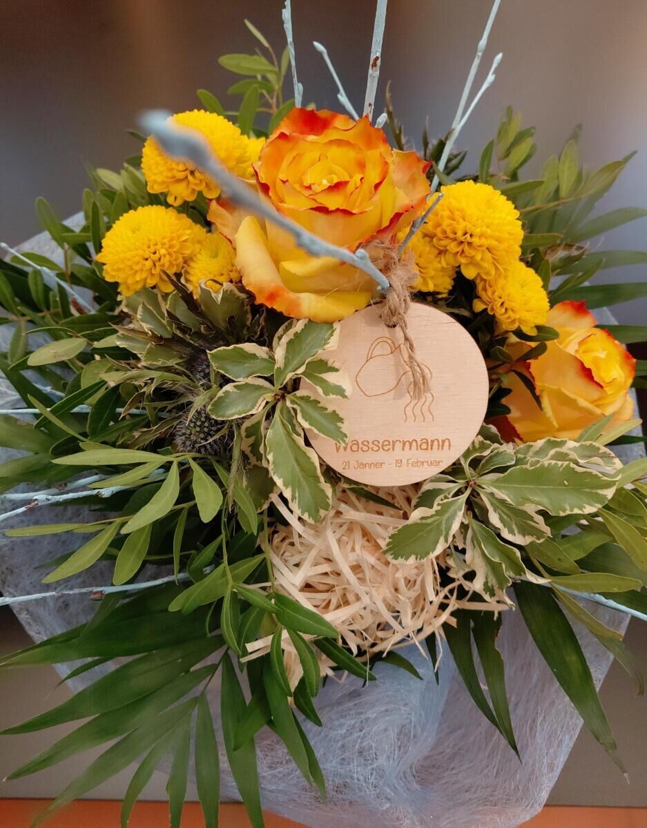 Jeder Strauß wird zudem mit einem eigens angefertigten Holzanhänger des jeweiligen Sternzeichens ergänzt.