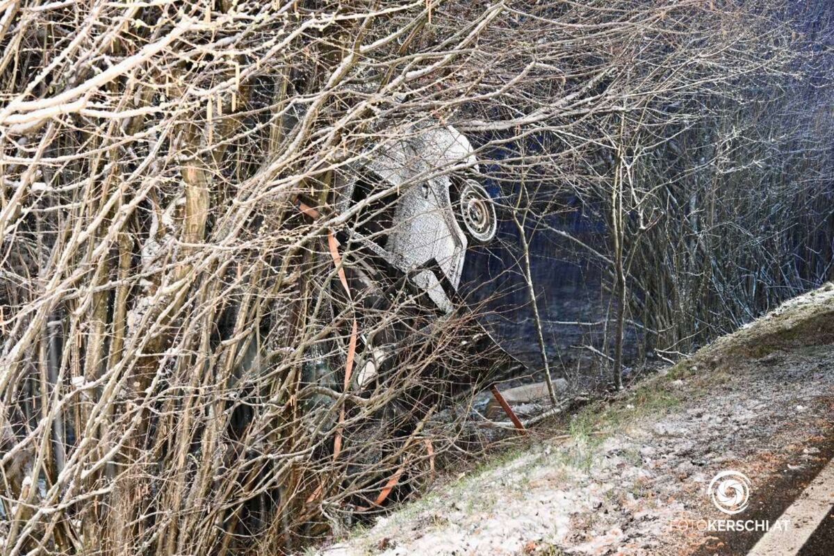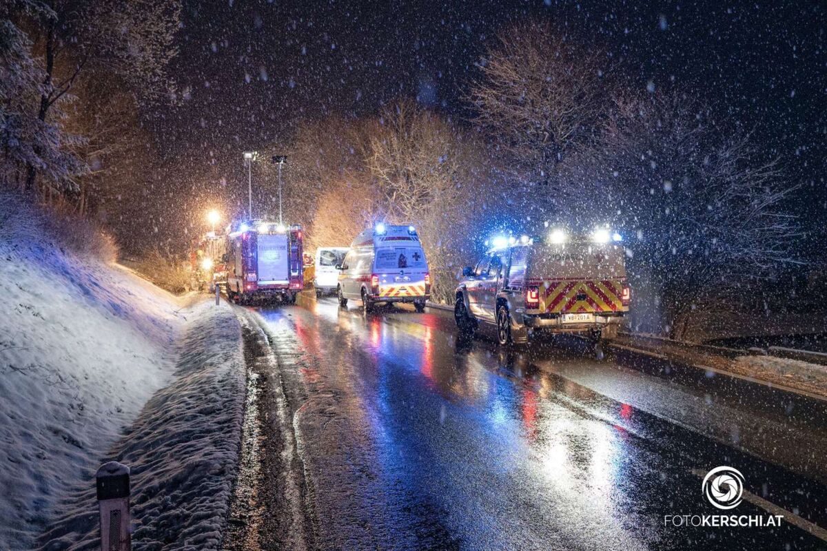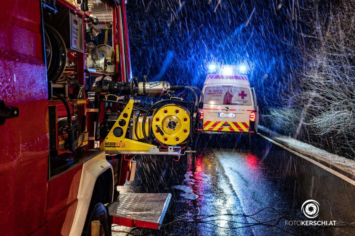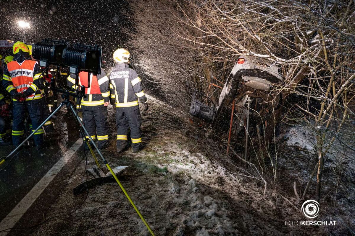Der Mann kam von der Straße ab, fuhr rund 50 Meter auf dem Bankett, beschädigte dabei mehrere Straßenleitpflöcke und ein Verkehrszeichen bevor er schlussendlich gegen einen Baum prallte. Durch die Wucht des Anpralls wurde das Auto mit dem Heck nach oben geschleudert und blieb an einem weiteren Baum hängen. Der Mann konnte sich vermutlich selbständig aus dem Fahrzeug befreien, rutschte aber daraufhin unter seinen Wagen und kam dort zu liegen. Ersthelfer sicherten das Fahrzeug vor dem Kippen, der Unfalllenker wurde von den Einsatzkräften gerettet und in das Salzkammergut Klinikum Vöcklabruck eingeliefert.