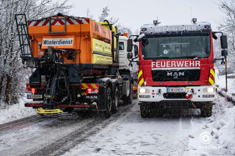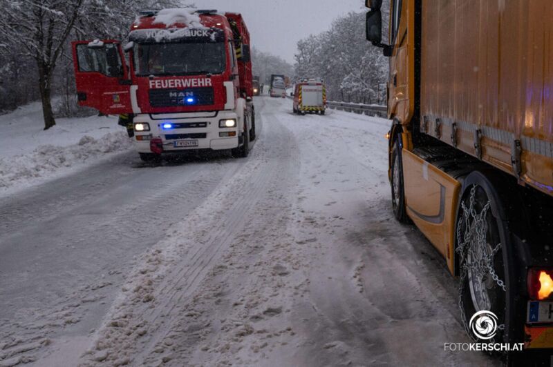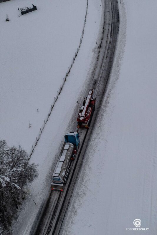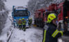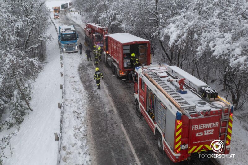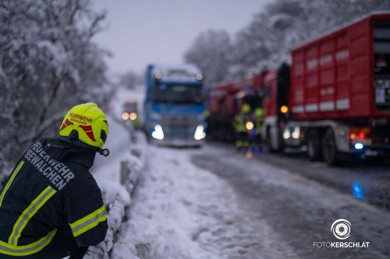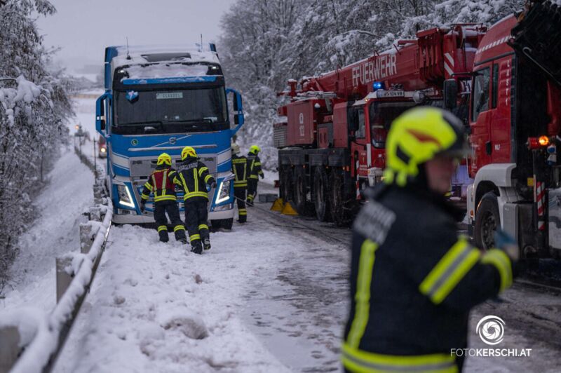 Die Feuerwehren Seewalchen und Vöcklabruck zogen den Lkw mit mehreren Seilwinden zurück auf die Straße und schleppten ihn dann mit dem Kranfahrzeug die Steigung hinauf.