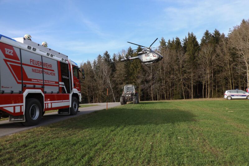 NIEDERTHALHEIM. Feuerwehr, Rettungsdienst, Notarzthubschrauber und Polizei standen Freitagvormittag bei einem schweren Forstunfall in Niederthalheim im Einsatz.