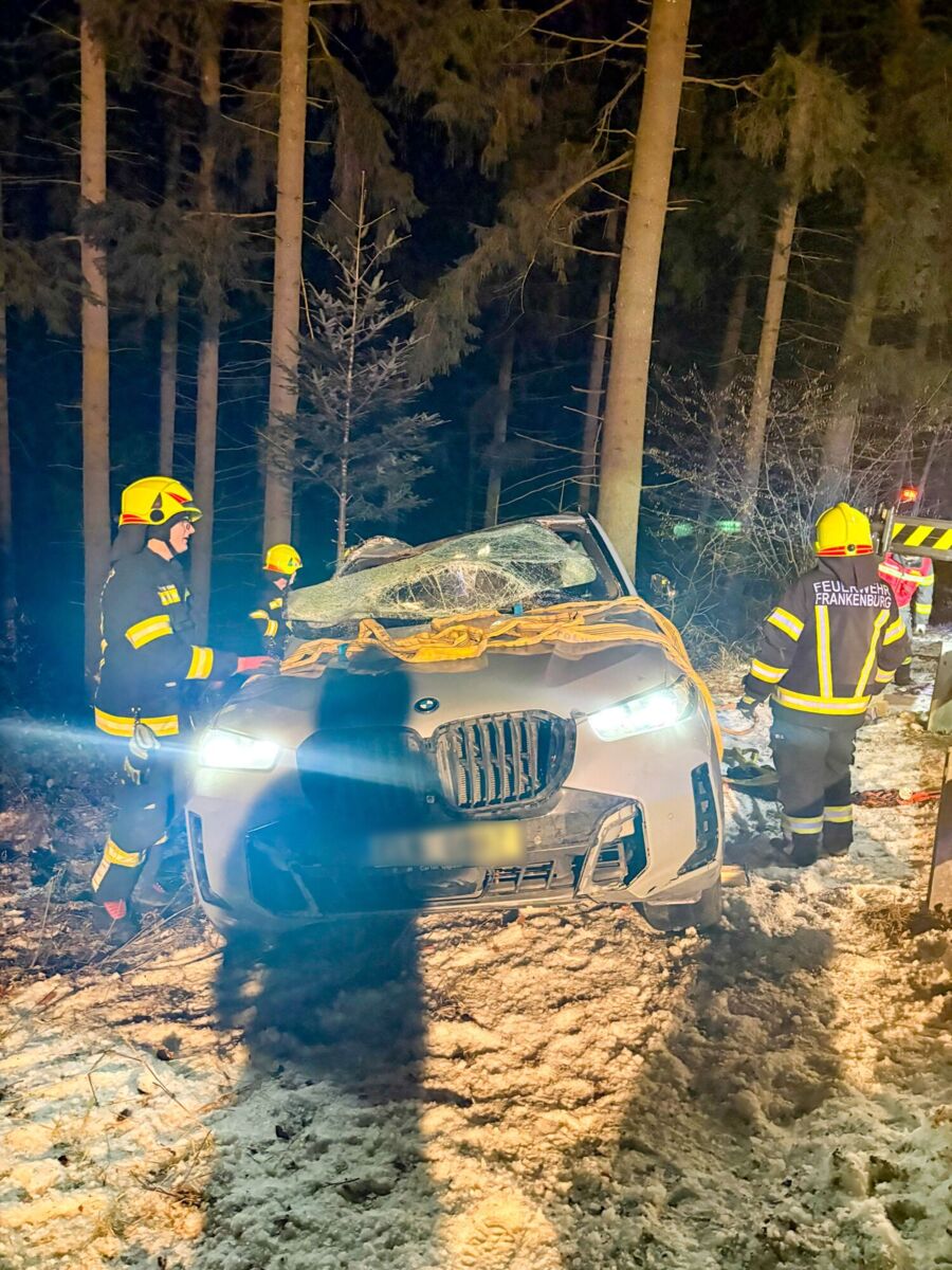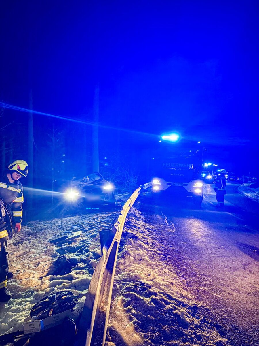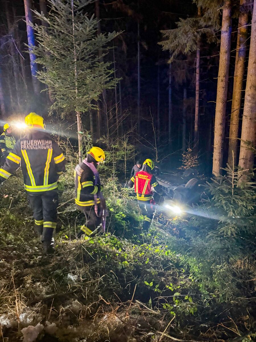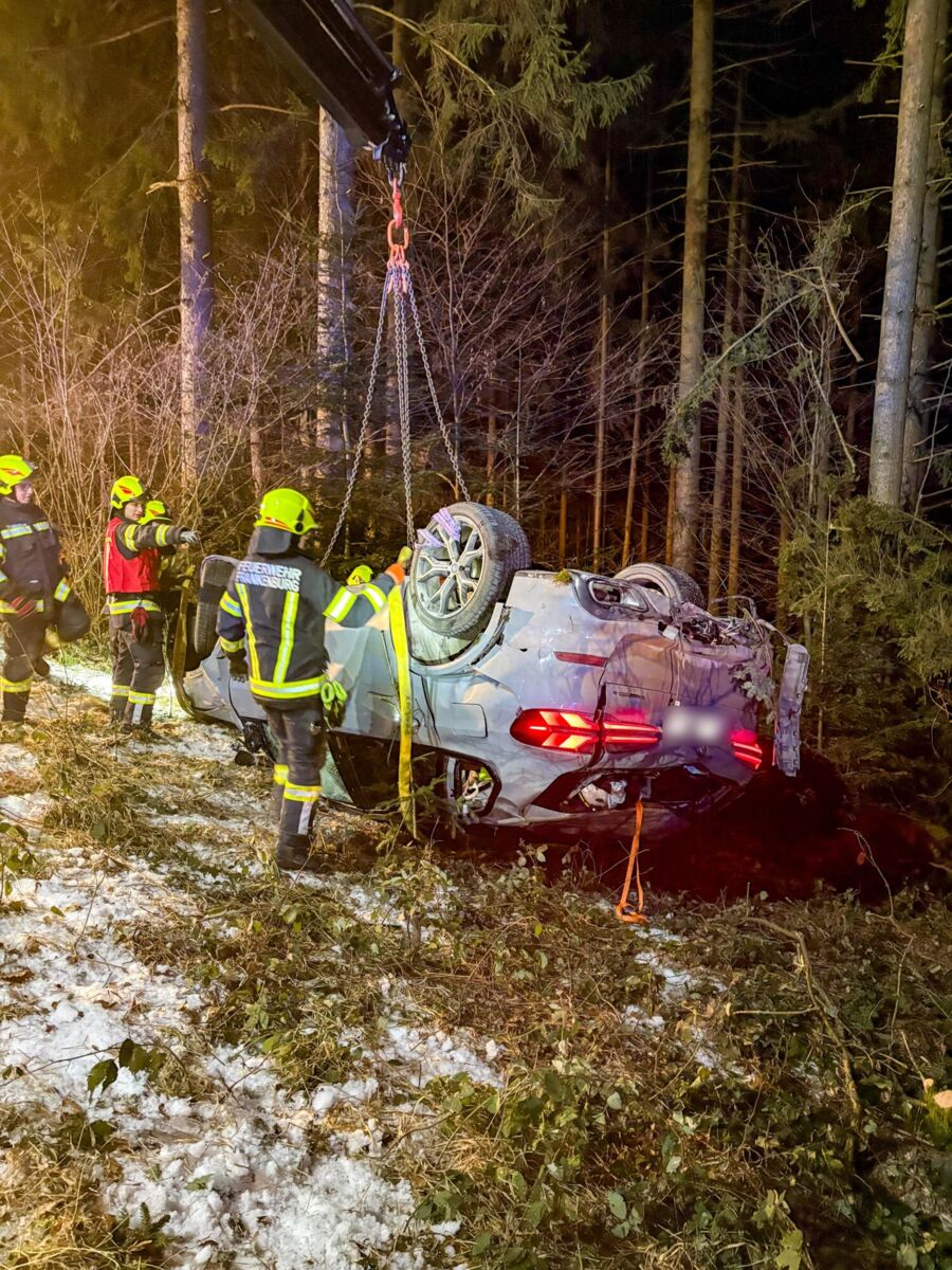 Gegen 20.49 Uhr wurden die Freiwilligen Feuerwehren Ampflwang im Hausruckwald und Eberschwang alarmiert. Ein Pkw war von der Fahrbahn abgekommen, hatte sich überschlagen und kam schließlich auf dem Dach im angrenzenden Waldstück zum Liegen.