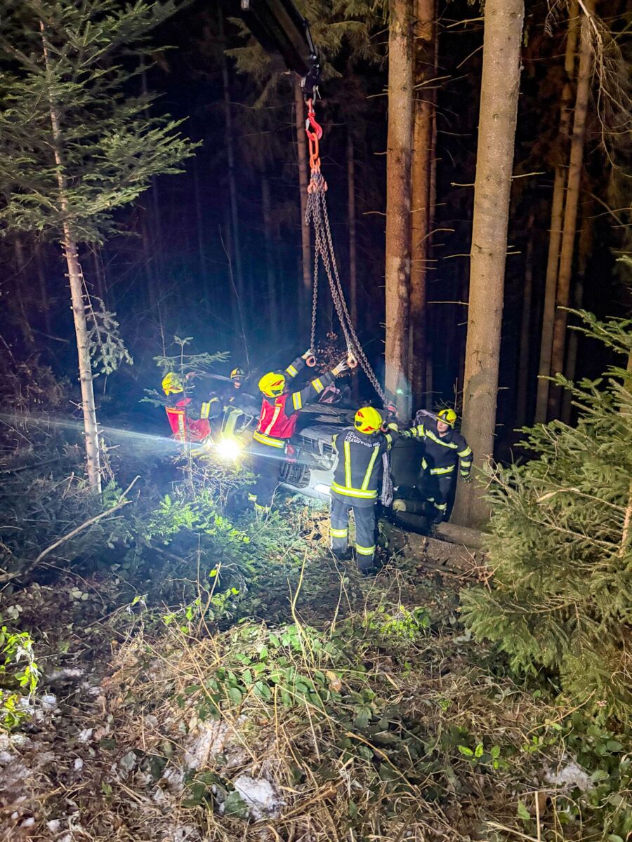 Zur Bergung des Unfallfahrzeuges wurde die Feuerwehr Frankenburg am Hausruck mit dem Kranfahrzeug nachalarmiert. Das Unfallauto konnte mithilfe des Krans aus dem Waldstück geborgen werden. Während des Einsatzes war die Hausruckstraße zeitweise nur eingeschränkt passierbar.