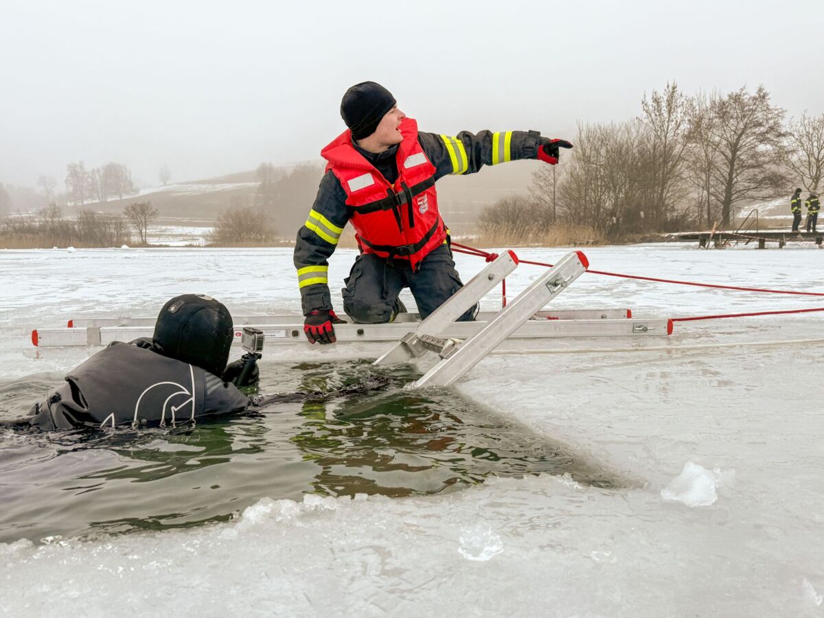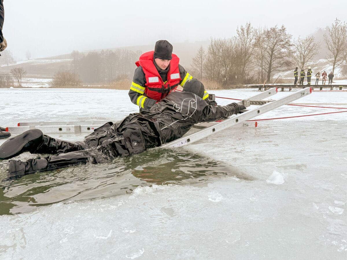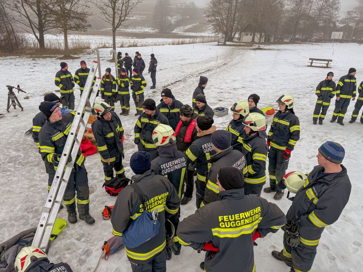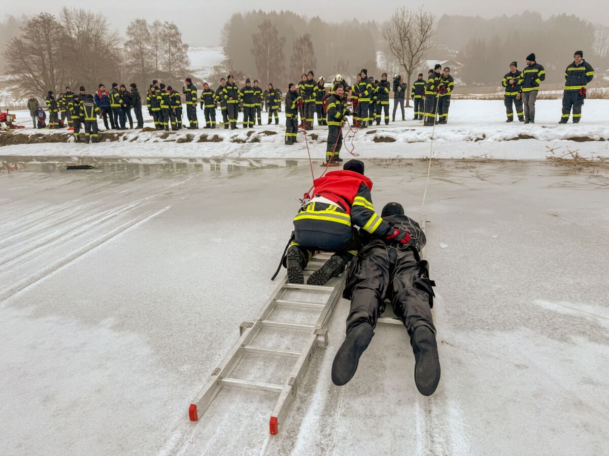Der Feuerwehrtaucher und Tauchgruppenleiter Jonathan Hansel schulte und vertiefte das vorhandene Wissen der Einsatzkräfte zum Thema Eisrettung, Unterkühlung und Belastbarkeit der Eisfläche. Bevor es zu den Praxisübungen auf den Irrsee ging, berichtete noch der Polizist, der versucht hatte, die eingebrochenen Frauen zu retten von der Rettungsaktion.