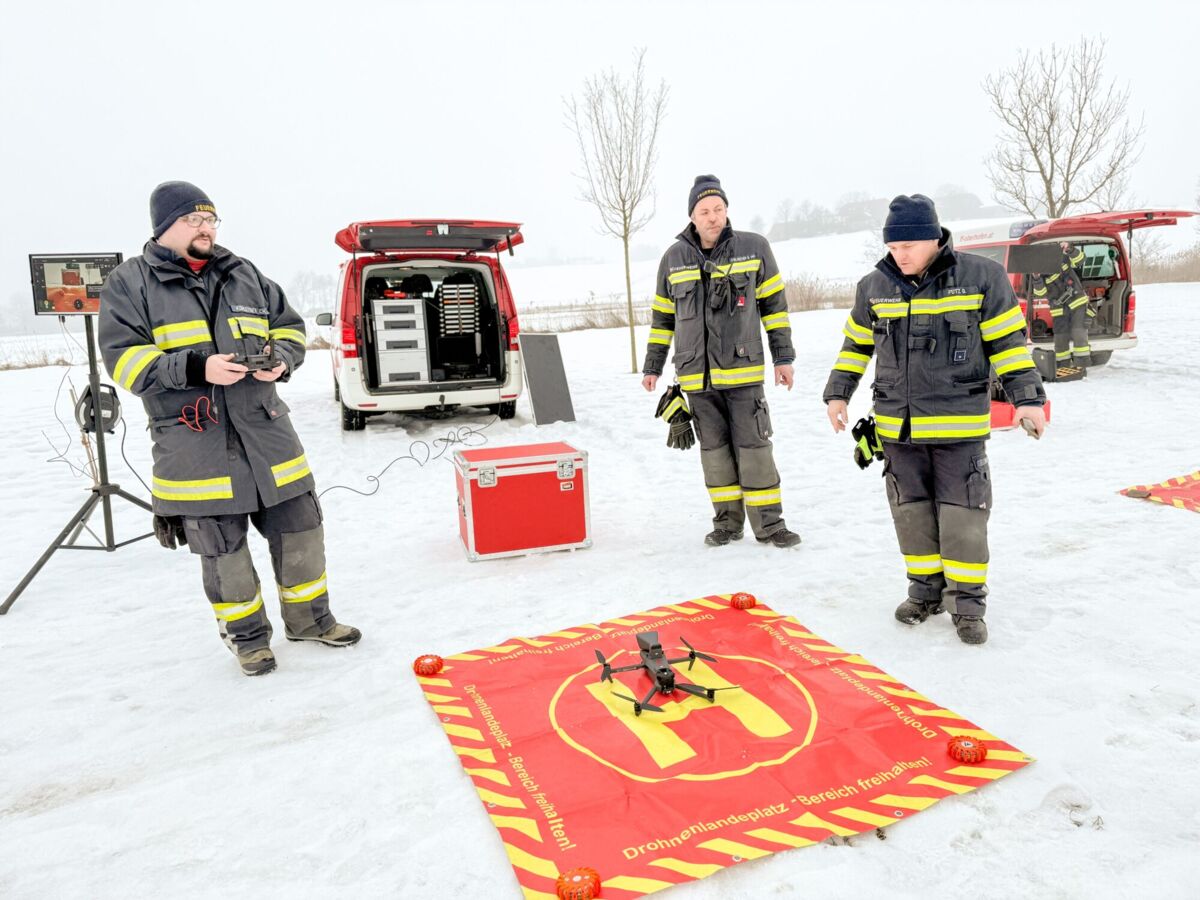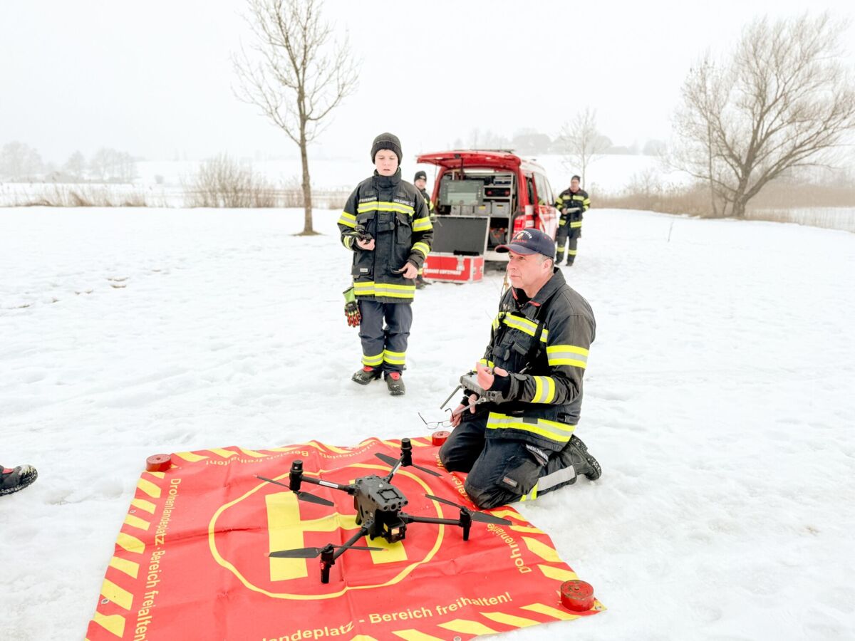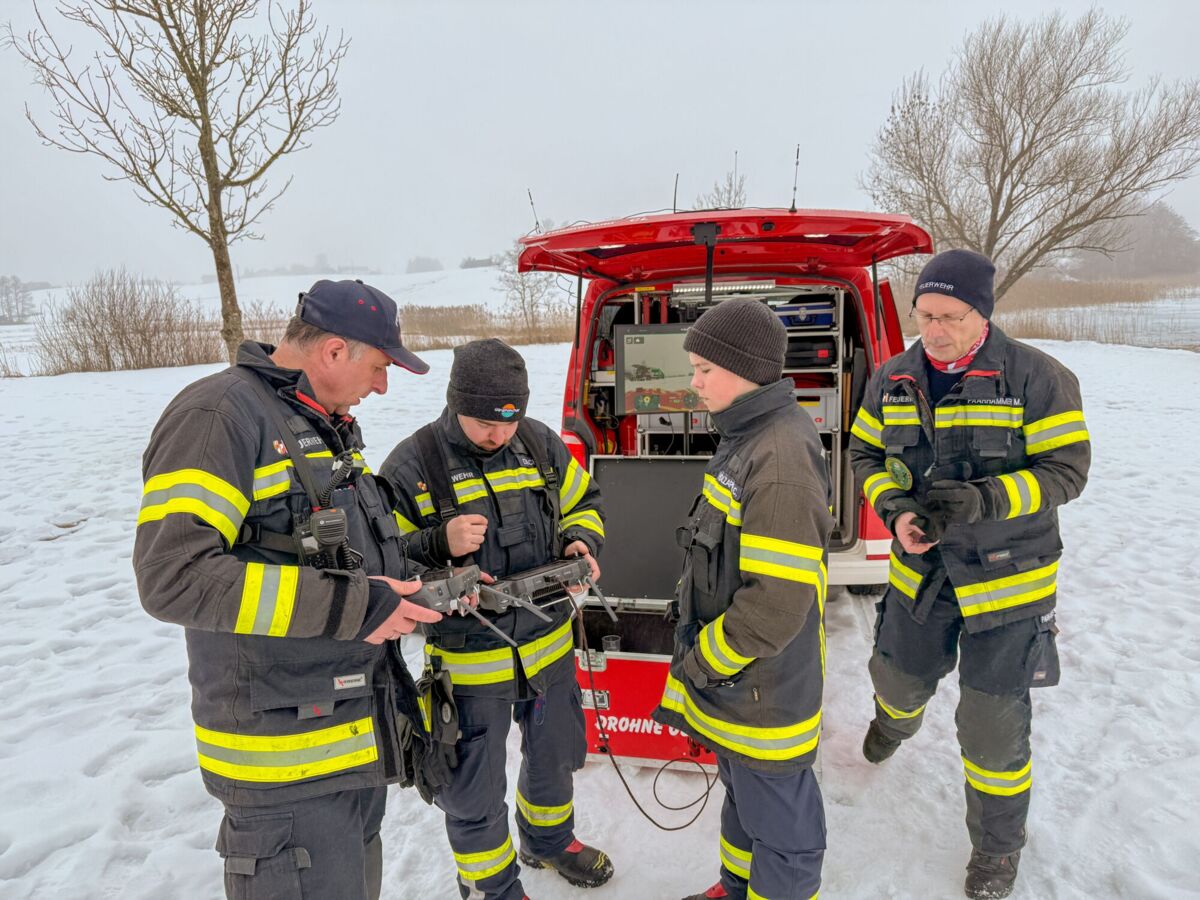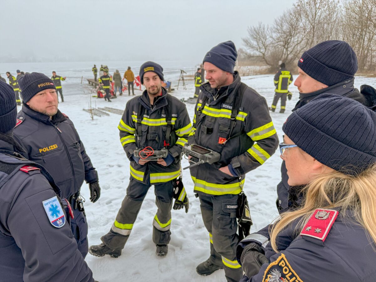 Am See wurde dann mit verschiedenen Einsatzmitteln die Rettung einer eingebrochenen Person geübt. Die Drohnen der Feuerwehrdrohnengruppe des Abschnitts Mondsee kümmerten sich um die Lagedarstellung und die Räumung des Gefahrenbereichs mittels Lautsprecherdurchsagen. Aufgrund des Nebels, der hohen Luftfeuchtigkeit und der Temperatur von minus zwei Grad kam es immer wieder zu leichten Propellervereisungen, somit konnten Drohnenflüge nur sehr selektiv und in geringer Höhe erfolgen.