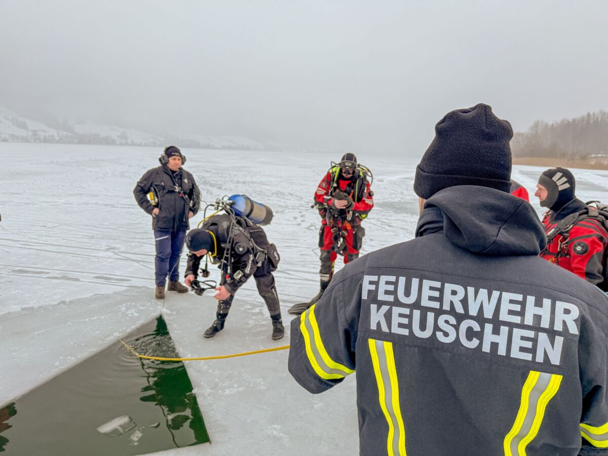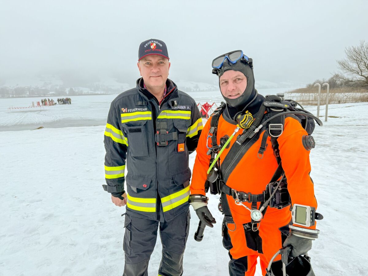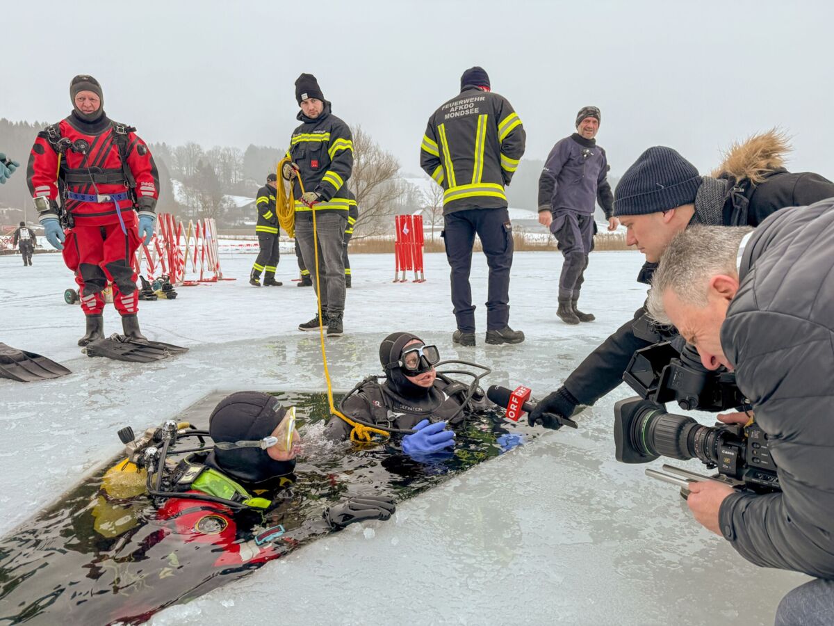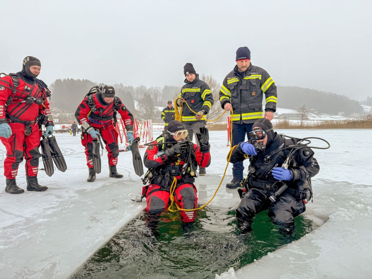 Nach dem dramatischen Einsatz und der erfolgreichen Hubschrauberrettung von zwei eingebrochenen Damen am Irrsee Ende Jänner organisierte Daniel Weber, Ausbildungsleiter des Feuerwehrabschnittes Mondsee, gemeinsam mit der Feuerwehr Zell am Moos eine realistische Eisrettungsübung mit anschließenden Eistauchgängen der Feuerwehrtaucher.