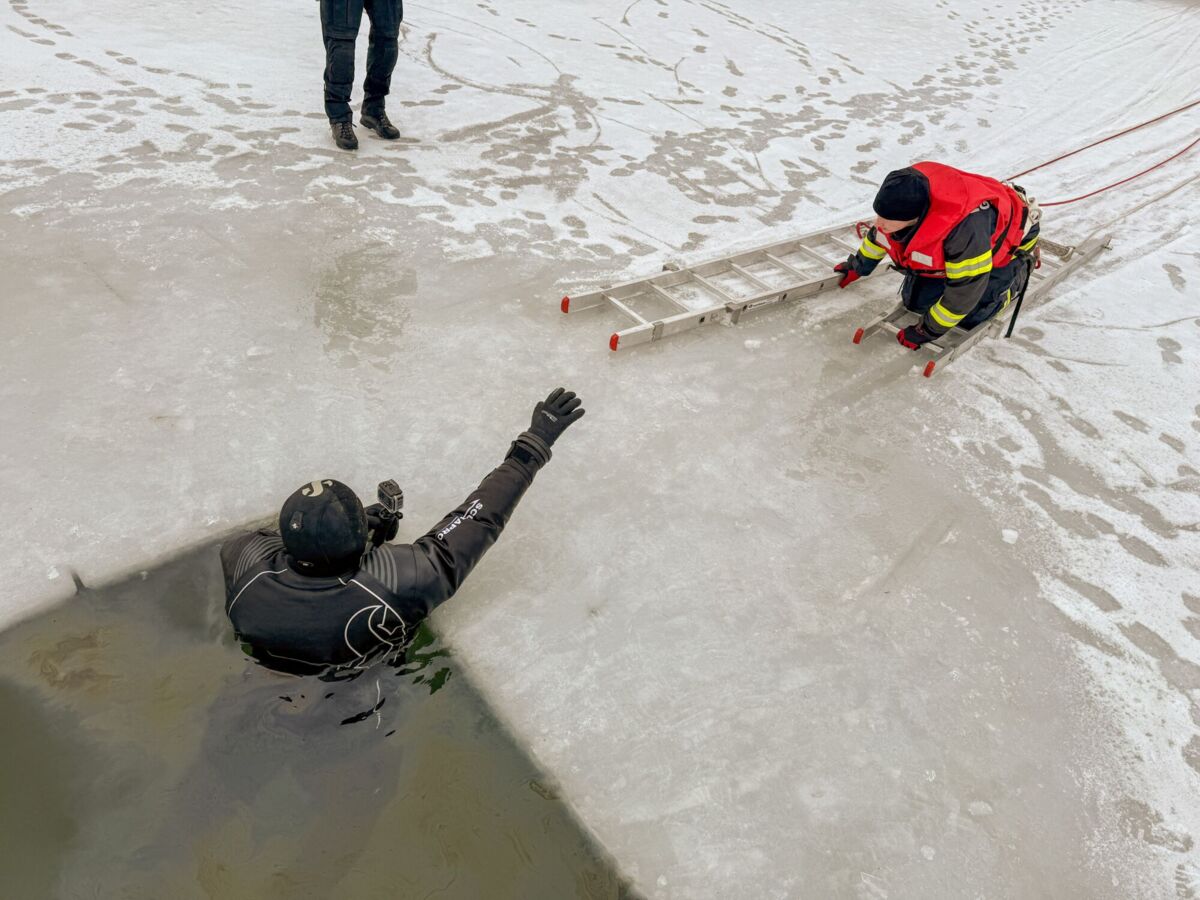 Im Anschluss an die Rettungsaktionen auf dem Eis übten die Feuerwehrtaucher des Tauchstützpunktes 4 die Personensuche unter dem Eis im Wasser.