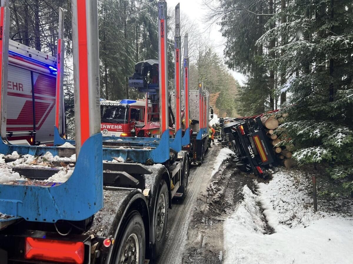 Plötzlich geriet der Holzanhänger ins Schlittern, wodurch auch das Zugfahrzeug von der Fahrbahn in den angrenzenden Straßengraben abkam und samt Anhänger in der steilen Böschung umkippte“, schildert die Polizei.