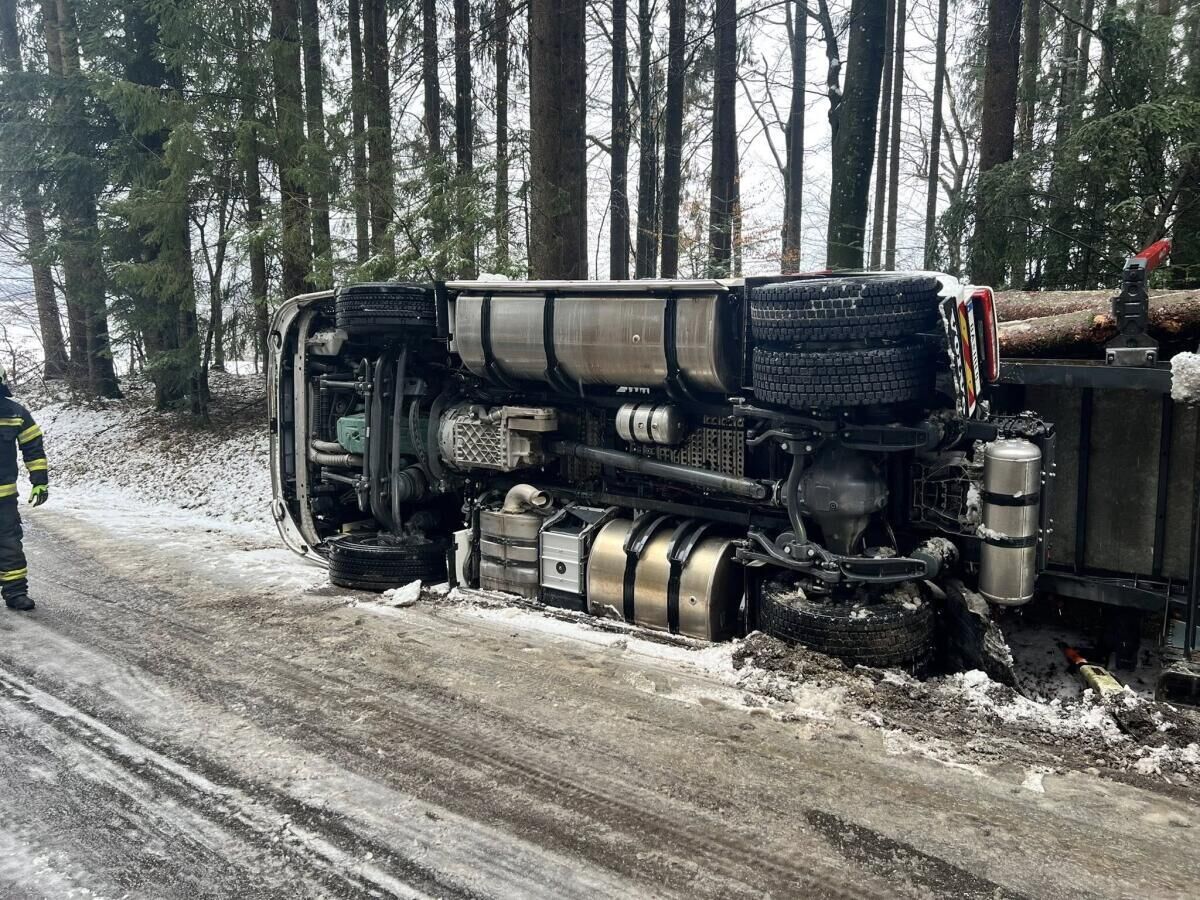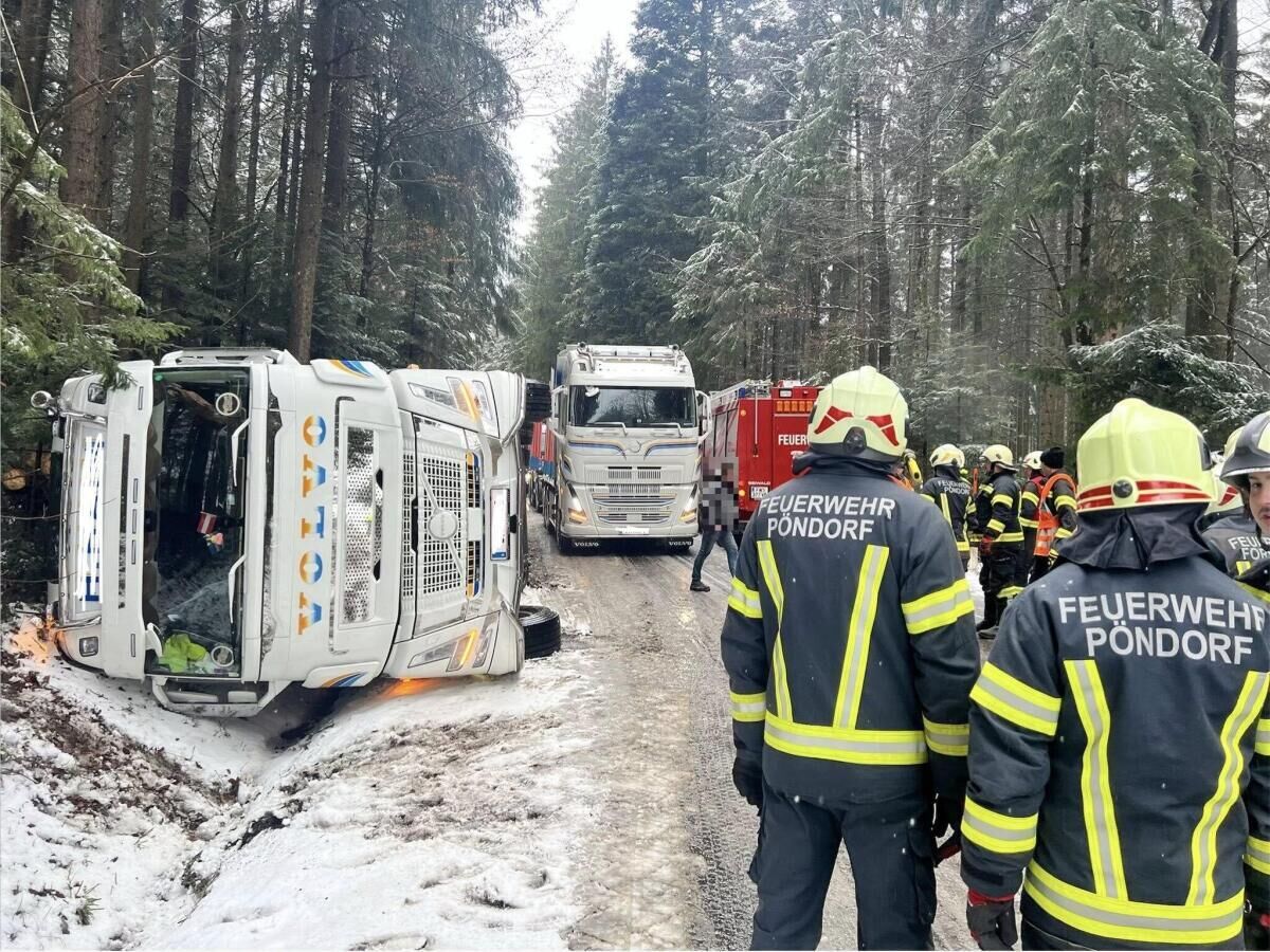 Ein vollbeladener Lkw war aufgrund der winterlichen Fahrbahnverhältnisse von der Pöndorfer Landesstraße abgekommen und in weiterer Folge umgestürzt. Der Lenker konnte das Fahrzeug selbstständig verlassen und wurde vom Roten Kreuz versorgt und anschließend in ein Krankenhaus gebracht.