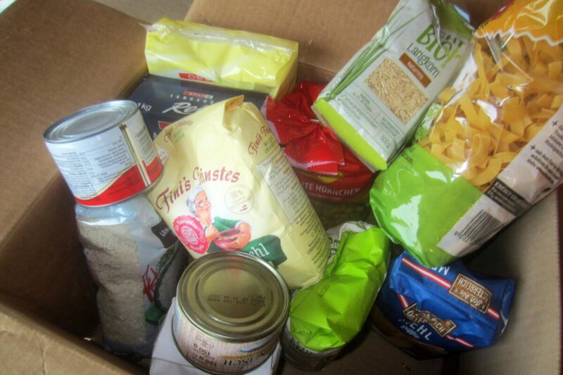 Für die Lebensmittelpakete werden folgende Sachen benötigt: Reis, Nudeln, Mehl, Zucker, Fleisch- und Fischkonserven, Dosenfrüchte und Süßigkeiten für Kinder. Auch Geldspenden zum Ankauf von Lebensmitteln können abgegeben werden.