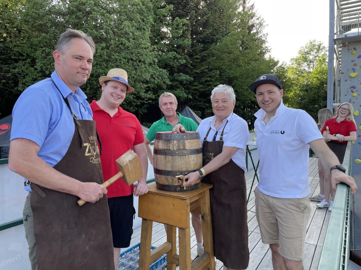 PUCHKIRCHEN. Gemeinde und Pfarre Puchkirchen dokumentierten die gute Zusammenarbeit mit den Veranstaltern des Hinterholzfestes mit einem gemeinsamen Bieranstich.
