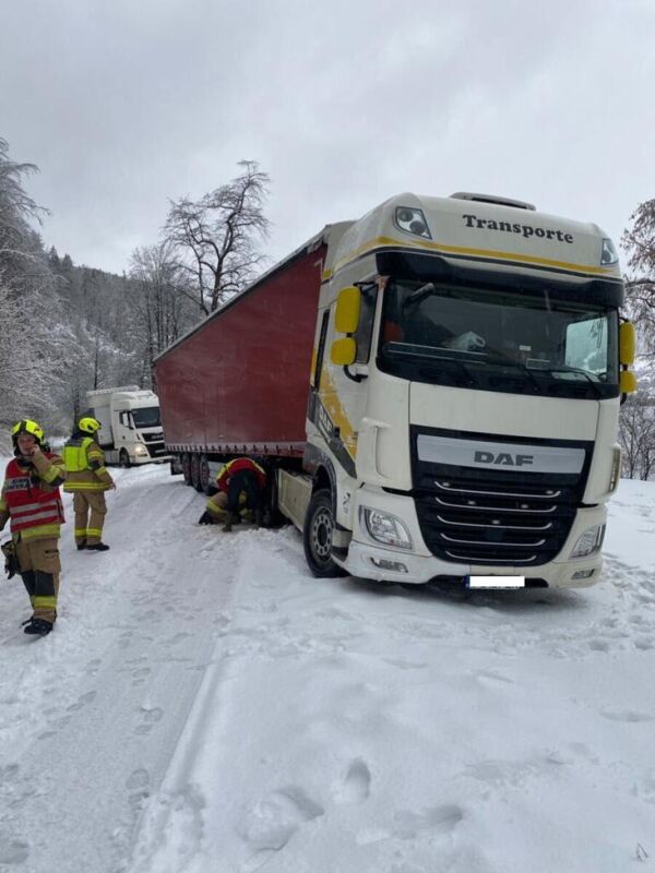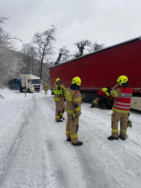 Unmittelbar wurde mit der Bergung der Fahrzeuge oder dem Wegschleppen begonnen. Ein Teil der Feuerwehrkameraden unterstützte die Lkw-Fahrer beim Anlegen der Ketten. In weiterer Folge musste die Feuerwehr Steinbach nachalarmiert werden, da ein Lkw nur von der Steinbacher Seite weggeschleppt werden konnte.