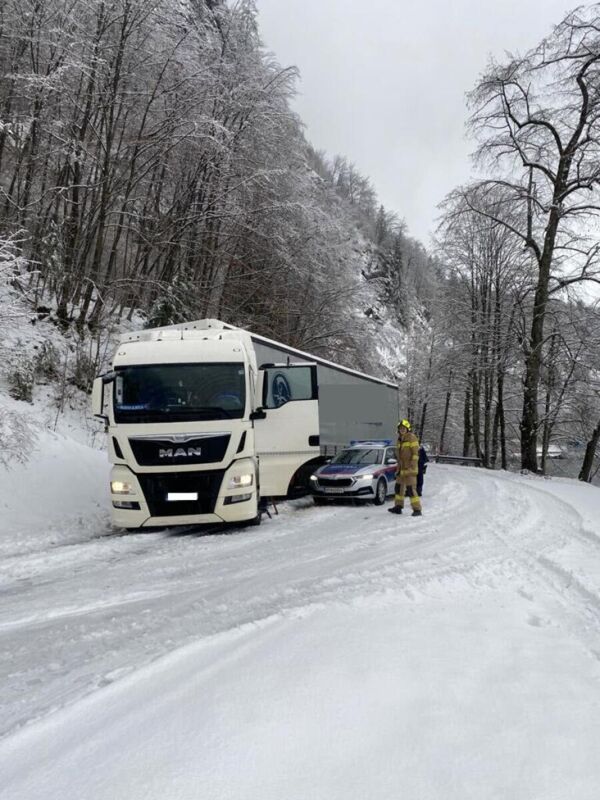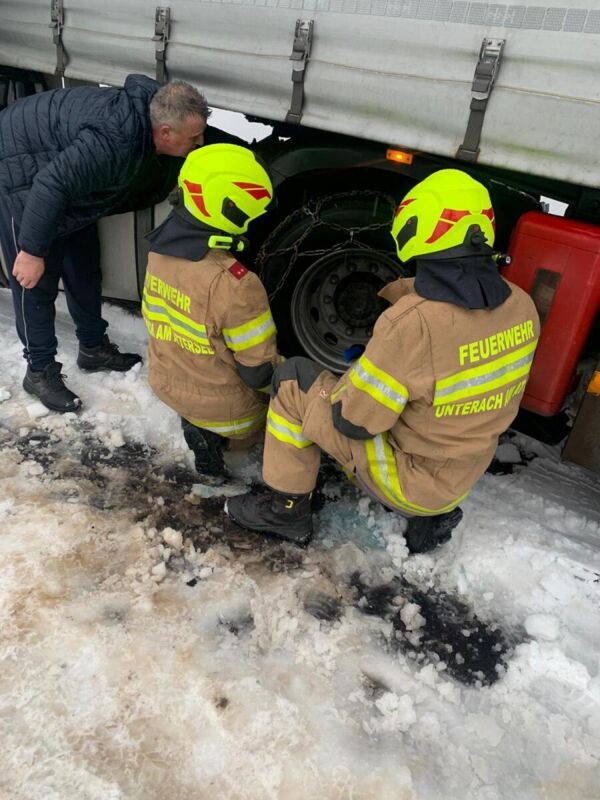 UNTERACH. Die Feuerwehr Unterach wurde gestern, 2. Februar, kurz nach 13.30 Uhr zu einer Lkw-Bergung auf die B152 Seeleiten Straße alarmiert. Die am Ufer des Attersee verlaufende Straße war durch die starken Schneefälle im Bezirk Vöcklabruck eine rutschige Schneefahrbahn