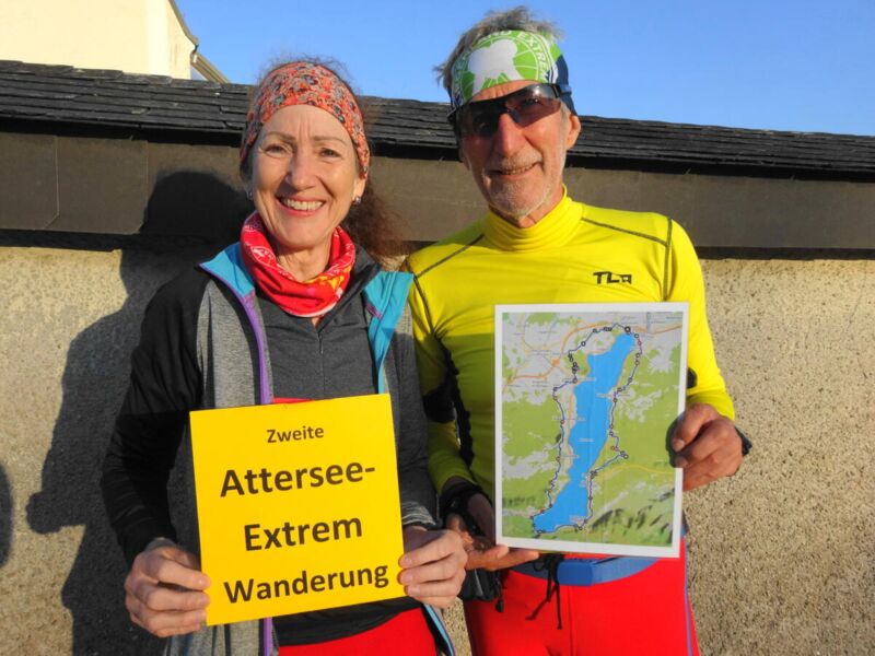 Als „Abenteuer vor der eigenen Haustür“ beziehungsweise als „leichtere Alternative zum Traunsee Bergmarathon“ bezeichnet Alois Schieber die Attersee-Extrem Wanderung. Sie führt Großteils auf dem Attersee West- und Ostwanderweg entgegen dem Uhrzeigersinn um den See, ist zirka 63 Kilometer lang und überwindet fast 2.000 Höhenmeter. Damit ist diese Runde eine Herausforderung für ausdauernde Wanderer oder Ultraläufer. Heuer wurde der Vöcklabrucker Alois Schieber von der Ultraläuferin Ilse Fritz aus Zipf begleitet. Sie ist Vizestaatsmeisterin im 100 Kilometer Lauf und startet für den Verein „ASKÖ Laufwunder Steyr“. Gemeinsam umrundeten die beiden den See bei besten Bedingungen in der Nettozeit von 11Stunden und 14 Minuten.