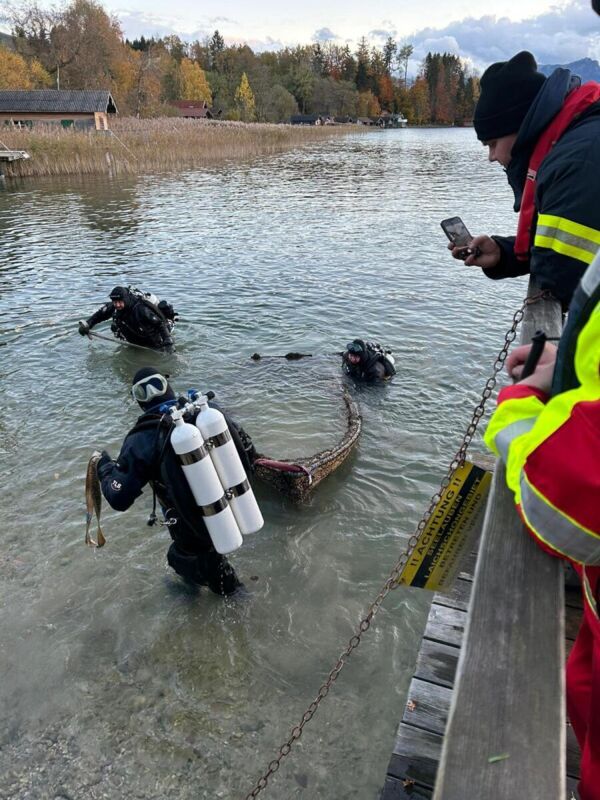 Taucher der Wasserrettung üben am Irrsee und entsorgen dabei jede Menge Müll