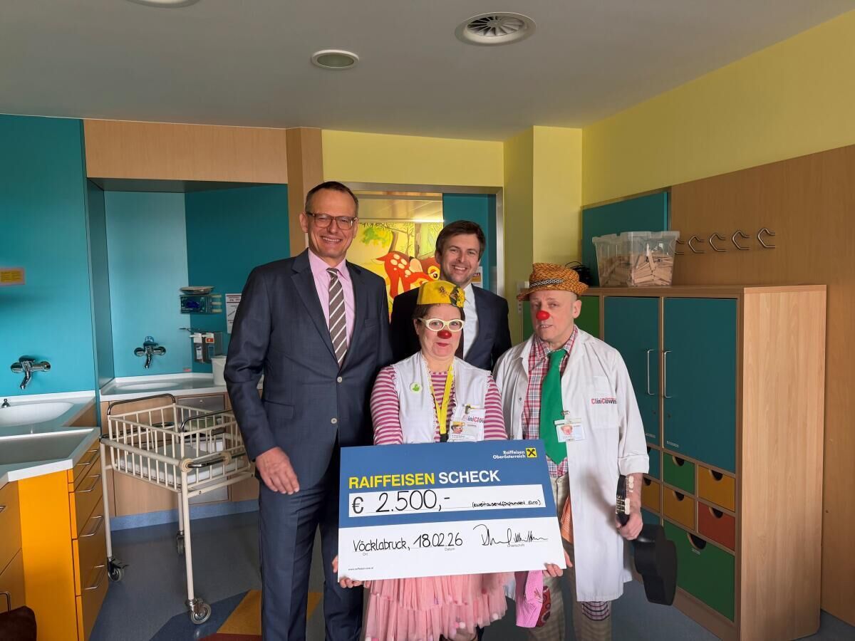 VÖCKLABRUCK. Die Raiffeisenbank Region Vöcklabruck unterstützte die CliniClowns OÖ mit einer Spende in Höhe von 2.500 Euro.