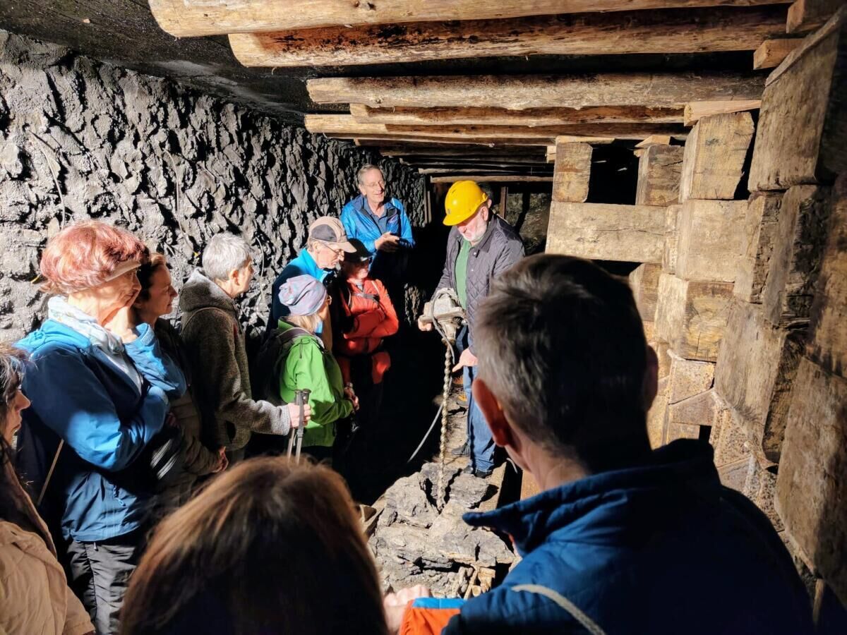 Ein besonderer Höhepunkt war der Besuch des Südfeldstollens in Thomasroith. Wilfried Eckstein führte die Gruppe durch den Stollen, der 1960 als letzter in der Region angeschlagen wurde und heute als Schaustollen zugänglich ist. Ein Film über die Entwicklung des Bergbaus sowie die anschließende Besichtigung zeigten, unter welch harten Bedingungen früher im Bergbau gearbeitet wurde.