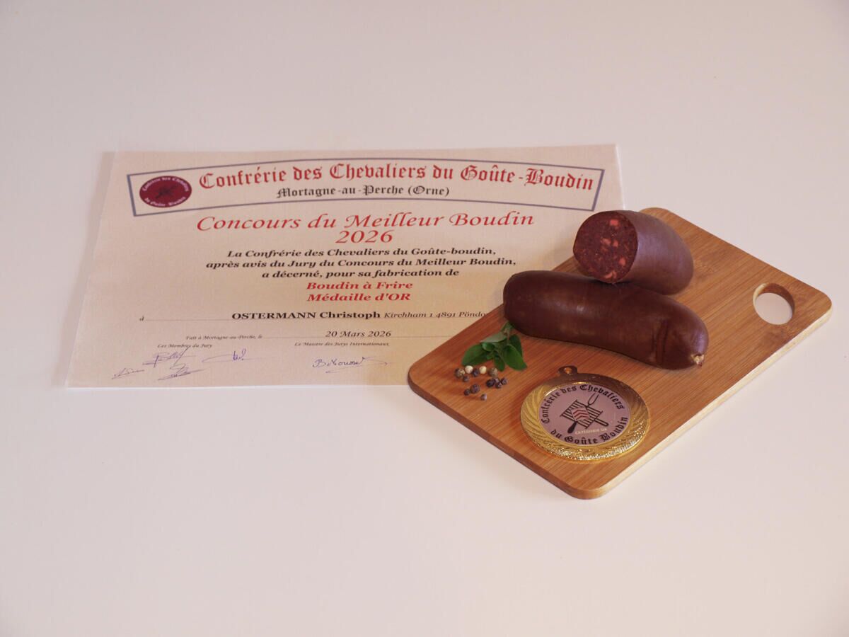 PÖNDORF. Die Metzgerei Maier aus Pöndorf wurde beim internationalen Rotwurstwettbewerb 2026 in der französischen Normandie mit einer Goldmedaille ausgezeichnet.