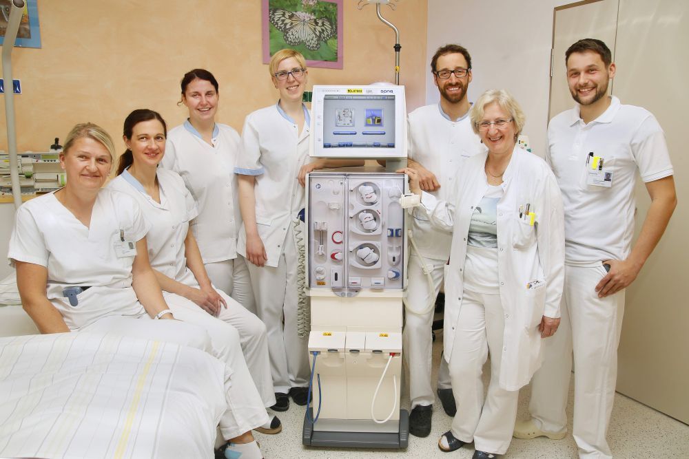 Bei chronischen Nierenerkrankungen im Endstadium kommt es durch die Einschränkung bzw. den Verlust der Nierenfunktion zu einer verminderten Ausscheidung von verschiedenen Abbauprodukten des Körpers sowie zu schwerwiegenden Störungen des Wasser- und Mineralstoffhaushalts. Das führt zu einer „Harnvergiftung des Blutes“ (Urämie), wodurch der gesamte Organismus der Patienten in Mitleidenschaft gezogen wird. In so einem Fall benötigen die Betroffenen eine Dialyse. Dabei werden die Giftstoffe mit einem Filter aus dem Blut ausgewaschen. Die Hämodialysebehandlung ist, ebenso wie andere Nierenersatztherapien - Bauchfelldialyse und Nierentransplantation - eine Errungenschaft der modernen Medizin, die dem Menschen trotz unzureichender oder sogar ganz fehlender Nierenfunktion ein gutes Weiterleben ermöglicht. Die Wirksamkeit dieser Entgiftung erreicht zwar nicht die von gesunden Nieren, ermöglicht aber den Patienten in Kombination mit einer entsprechenden Ernährung und eingeschränkter Flüssigkeitsaufnahme über Jahre, manchmal sogar Jahrzehnte, eine vergleichsweise gute Lebensqualität. Mittlerweile werden im Salzkammergut-Klinikum Vöcklabruck in einem 5-Schicht-Betrieb auf 6 Plätzen 30 Patienten behandelt. Ein weiterer Platz ist für Akutfälle reserviert, von denen es allein im Jahr 2014 250 gab. In Summe wurden seit der Eröffnung 2005 mehr als 35.000 Dialysen durchgeführt. „Durch die Erweiterung der Kapazitäten können wir seit Sommer 2014 noch mehr Dialysepatienten als bisher betreuen. Die Abendschicht ist dabei vor allem für jene Patienten wichtig, die im Berufsleben stehen und erst nach Dienstende zur Dialyse kommen können“, sagt Oberärztin Maria Bernadette Roberts, Leiterin der Dialysestation am Salzkammergut-Klinikum Vöcklabruck. „Viele der Patienten sind seit der Eröffnung 2005 bei uns in Behandlung, dadurch ist der Ablauf auf der Station mittlerweile sehr familiär. Für mich ist es besonders schön, zu sehen, dass diese Menschen trotz Dialyse ihre Lebensfreude behalten - zwei Hochzeiten von Patientinnen sind dafür ein schönes Zeichen.“ Das bestätigen auch die zwölf Mitarbeiter im Pflegebereich, die über langjährige praktische Erfahrung und eine entsprechende Zusatzausbildung verfügen. „Unsere Patienten kommen dreimal pro Woche für mindestens 4 Stunden zu uns. Da entsteht natürlich eine gewisse Vertrautheit, die uns besonders auszeichnet. Manche der Patienten freuen sich sogar auf die Dialyse, weil sie hier etwas Ansprache und Abwechslung von ihrem Alltag finden“, erklärt Thomas Neuhauser, Stationsleiter der Dialysestation am Salzkammergut-Klinikum Vöcklabruck. „Das multidisziplinäre Team, das neben Ärzten und Pflegekräften auch Physiotherapeuten, Seelsorger und Diätologen umfasst, ist darum bemüht, jeden Patienten und jede Patientin ganzheitlich zu betreuen. Unsere Patienten profitieren aber auch von der sehr guten Zusammenarbeit der verschiedenen medizinischen Fachrichtungen im Salzkammergut-Klinikum Vöcklabruck - wie etwa bei der gefäßmedizinischen Versorgung. Dieser „Rundumservice“ ist uns sehr wichtig, immerhin verbringen Dialysepatienten rund 1.000 Stunden im Jahr hier auf unserer Station - da sollen sie sich auch gut aufgehoben fühlen.“