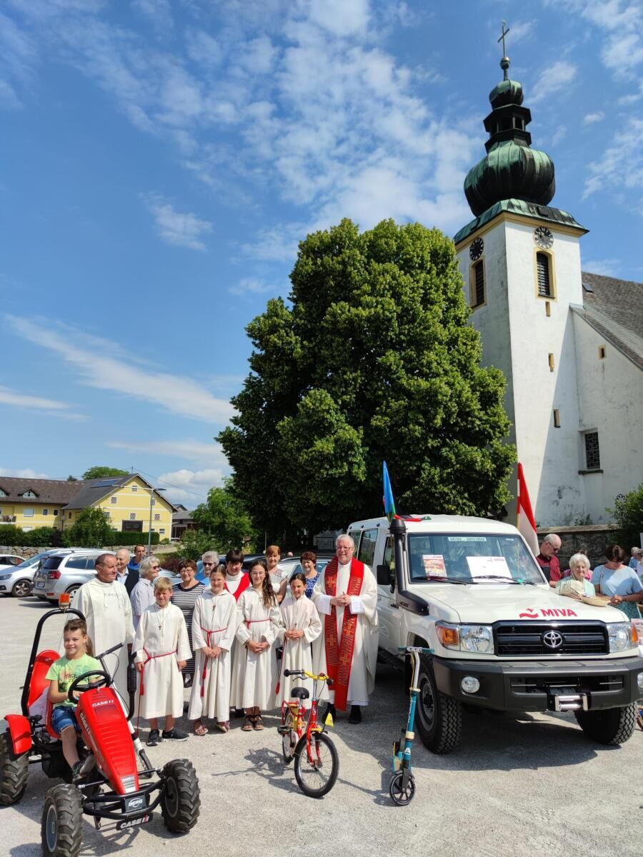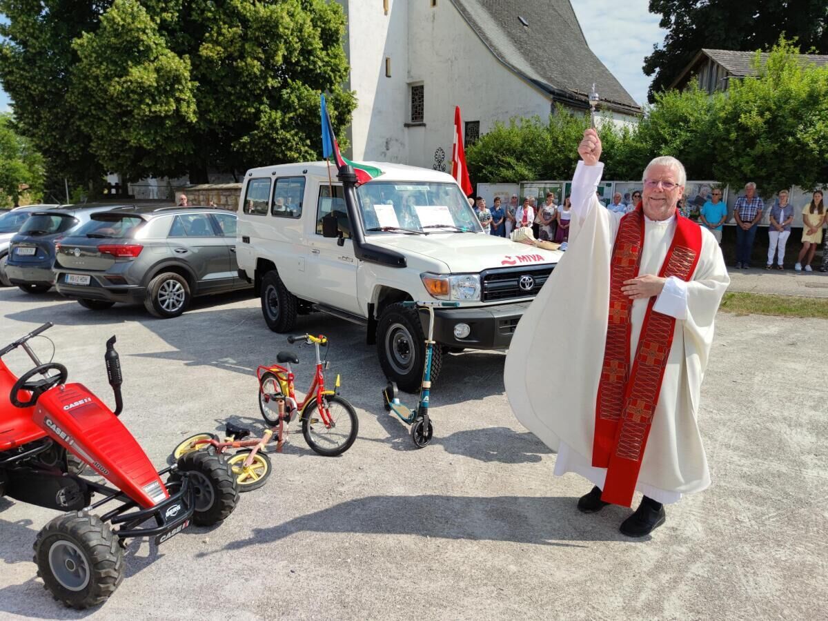 DESSELBRUNN. Eine Woche vor dem so genannten ChristophorusSonntag, dem 23. Juli, lud die Pfarre Desselbrunn zur Fahrzeugsegnung ein. Höhepunkt war die Segnung eines MIVA-Autos für den bevorstehenden Einsatz im Südsudan. Die Straßenverhältnisse in dem afrikanischen Land sind äußerst prekär. In der Diözese Rumbek, in der das Fahrzeug zum Einsatz kommt, gibt es keine einzige asphaltierte Straße. Besonders in der Regenzeit führt dies zu besonderen Herausforderungen.