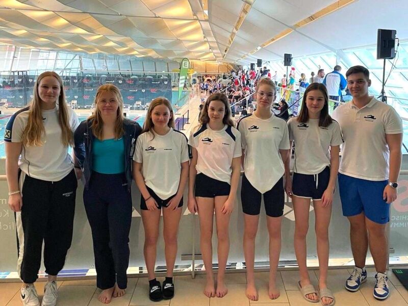 Nachmittags ging es für Pia Part, Sara Maric und Marie Sophie Marschall (Jg. 2008), sowie Mattea Stetina (Jg. 2009) und Maria Maak (Jg. 2010) direkt weiter über die 100 m Rücken. Einige persönliche Bestzeiten und eine Top 10 Platzierung von Pia Part bestätigten die starke Form der Mädchen. Die 15-jährige Marie Sophie absolvierte noch zusätzlich mit Bravour und einer persönlichen Bestleistung die 200 m Freistil.