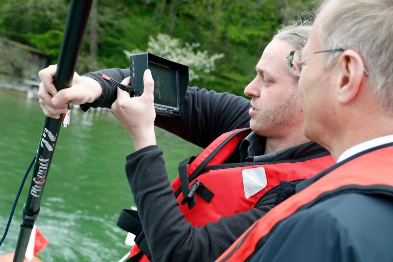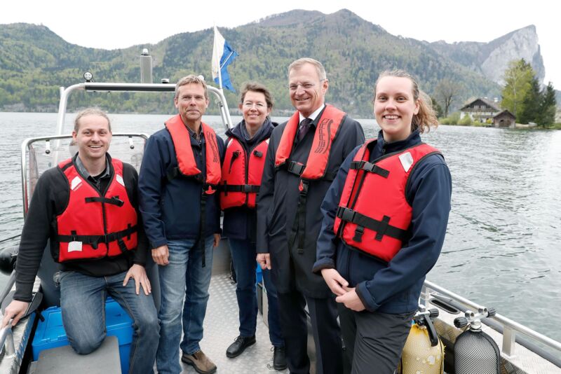 „Wir haben uns sehr gefreut, dass sich der Landeshauptmann persönlich die Zeit genommen hat, einen Blick auf unsere Grabung zu werfen“, berichtet Jutta Leskovar vom Oberösterreichischen Landesmuseum, die das Forschungsprojekt leitet. Dank modernster Technologie war ihm das in Mooswinkel auch im wörtlichen Sinne möglich: Das Team der Forschungstaucher ist nämlich mit einer Unterwasserkamera ausgestattet, welche ein Livevideo direkt an die Besucherinnen und Besucher an Bord des Forschungsbootes übertrug.