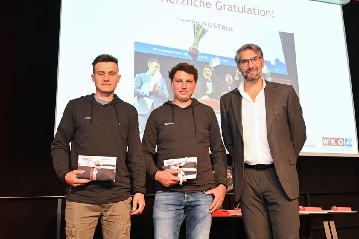 Neben der Ehrung für langjährige Selbständigkeit stand die feierliche Auszeichnung der Dachdecker-Weltmeister Daniel Hofer (Kapl Bau GmbH) und Bernhard Gösweiner (Dach Wieser GmbH) im Mittelpunkt. Landesinnungsmeister Innocente und Innungsgeschäftsführer Markus Hofer überreichten diese feierlich.