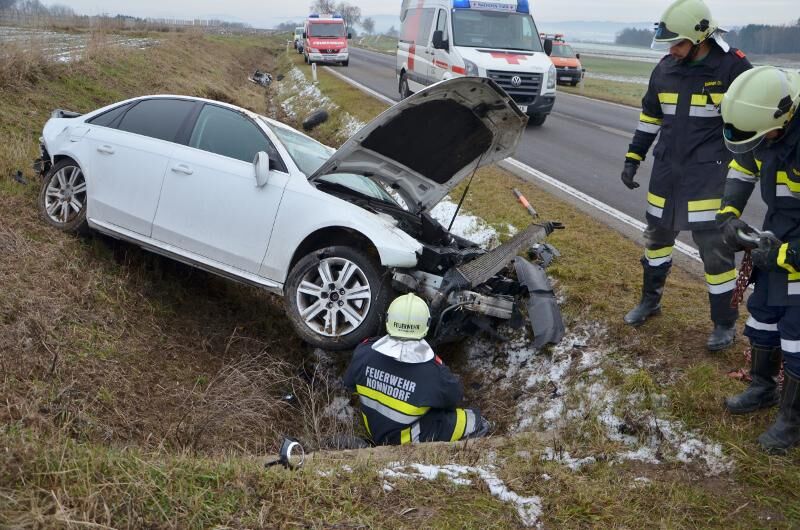 Am Mittwoch führte ein Ausweichmanöver zu einem Unfall auf der Bundesstraße 36 bei Nonndorf. Ein Lehrling aus dem Bezirk Zwettl fuhr mit seinem Fahrzeug von Waidhofen kommend Richtung Vitis, als - seinen Aussagen zufolge - ein Reh die Straße überquerte. Bei dem Ausweichmanöver geriet der Lenker mit seinem Fahrzeug in den rechten Straßengraben, krachte gegen eine betonierte Feldzufahrt, überschlug sich und schlitterte anschließend weitere 40 Meter im Straßengraben bis zu einer weiteren Feldzufahrt. Durch die Wucht wurde das linke Vorderrad abgerissen. Der junge Lenker konnte sein Fahrzeug leicht verletzt verlassen. Er wurde vom Roten Kreuz versorgt und ins Krankenhaus verbracht. Das schwer beschädigte Fahrzeug wurde von den Feuerwehren Nonndorf und Waidhofen/Thaya geborgen und abtransportiert. Während der Bergungsarbeiten kam es zu leichten Behinderungen des Verkehrs. Die Polizei führte die Verkehrsregelung durch.