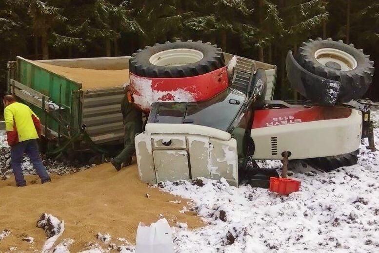 Nur eine Stunde später wurde ein weiterer Unfall gemeldet. Auf der Landesstraße 8057 bei Eggersdorf kam ein Traktor mit Anhänger, der mit zwölf Tonnen Weizen beladen war, auf der glatten Fahrbahn ins Rutschen und geriet in den Straßengraben. Daraufhin kippte das Gespann um und blieb im angrenzenden Acker liegen. Die Feuerwehren Eggersdorf und Karlstein führten die Bergungsarbeiten durch. Zuvor musste der Weizen mit einem Bagger umgeladen werden.