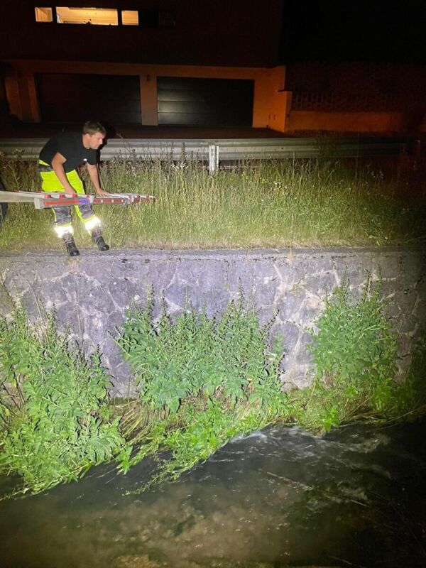 Der Biber mit einer großen Wunde am Rücken war auf der Straße und verschwand beim Eintreffen der Retter in den angrenzenden Bach. Das Tier wurde im Bachlauf gesucht und auch rasch gefunden. Weil der Bach mit einer Betonwand reguliert ist, musst das Tier über eine Leiter gesichert werden. Der Biber wurde zur weiteren Behandlung in das Tierheim Freistadt gebracht.