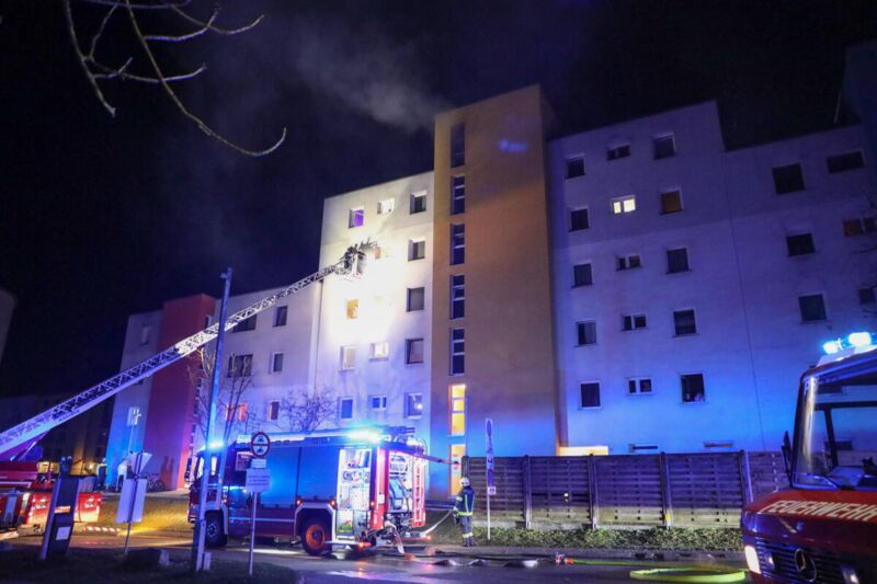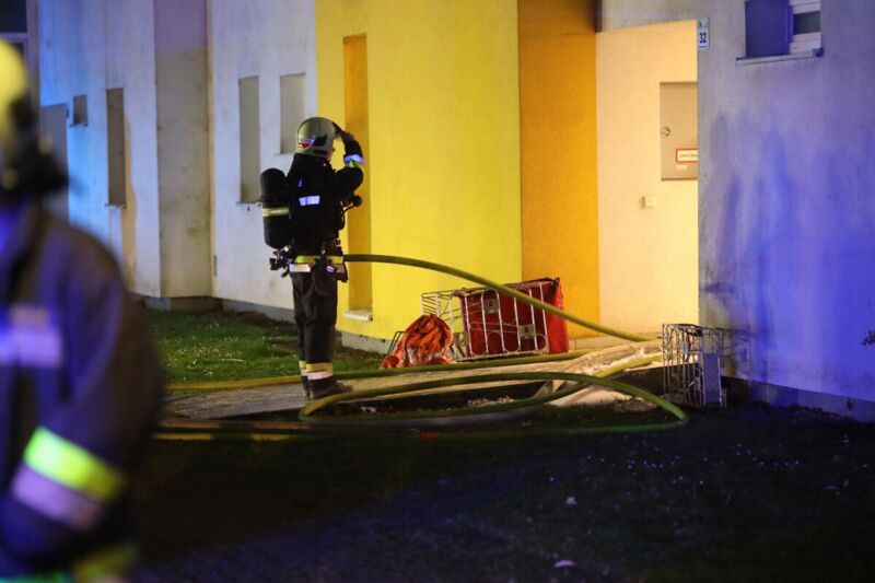 Die Einsatzkräfte der Feuerwehr wurden am späten Donnerstagabend um 23:21 Uhr zu einem Wohnungsbrand in das Siedlungsgebiet Noitzmühle alarmiert. Als sie dort ankamen, wurde ihnen von einer Explosion berichtet, woraufhin eine Wohnung in Vollbrand stand. Dichter Rauch drang aus dem Gebäude, die Flammen breiteten sich im Bereich der Fassade bereits auf angrenzende Wohnungen aus.