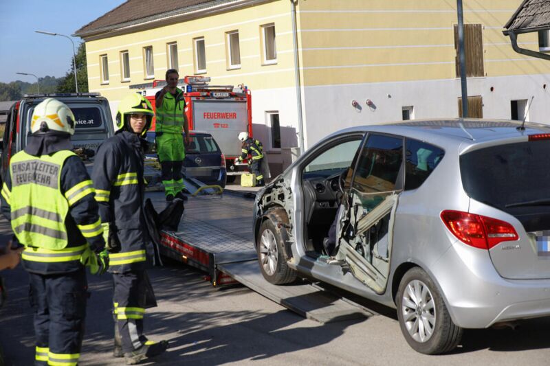 Auto bei Verkehrsunfall in Pichl bei Wels von landwirtschaftlichem Fahrzeug aufgeschält