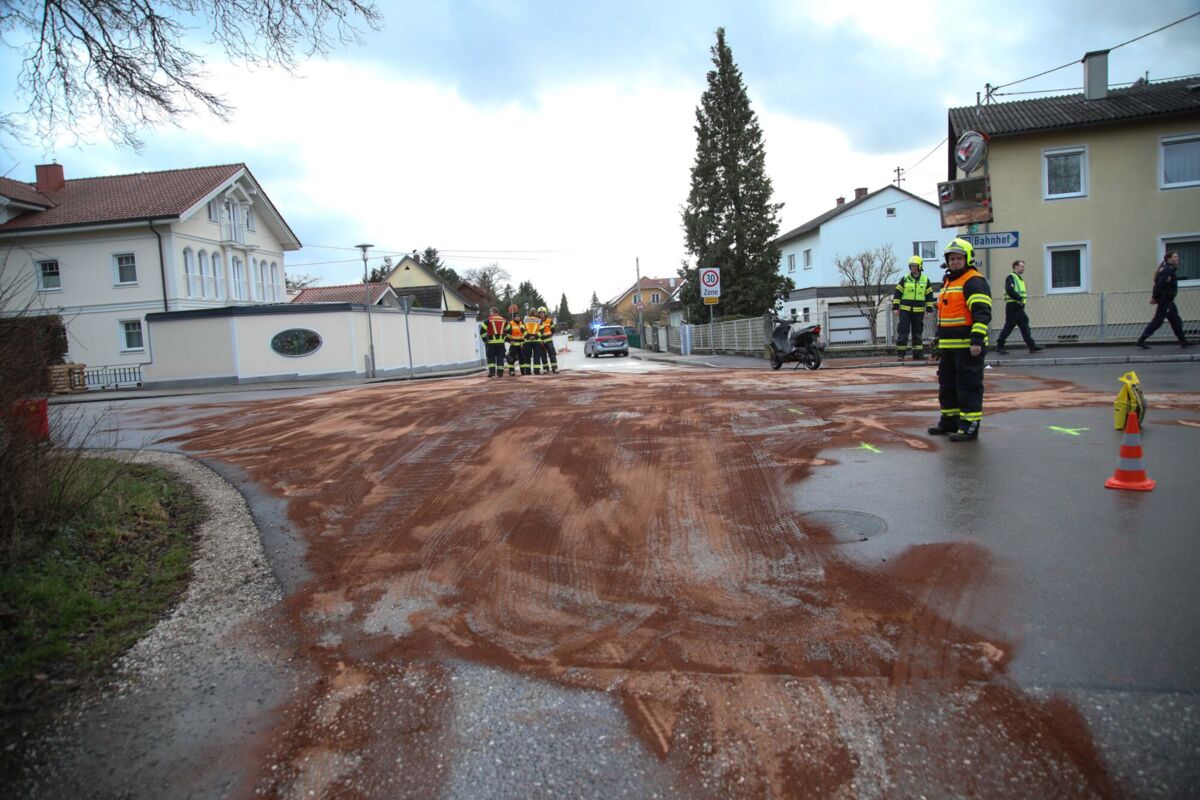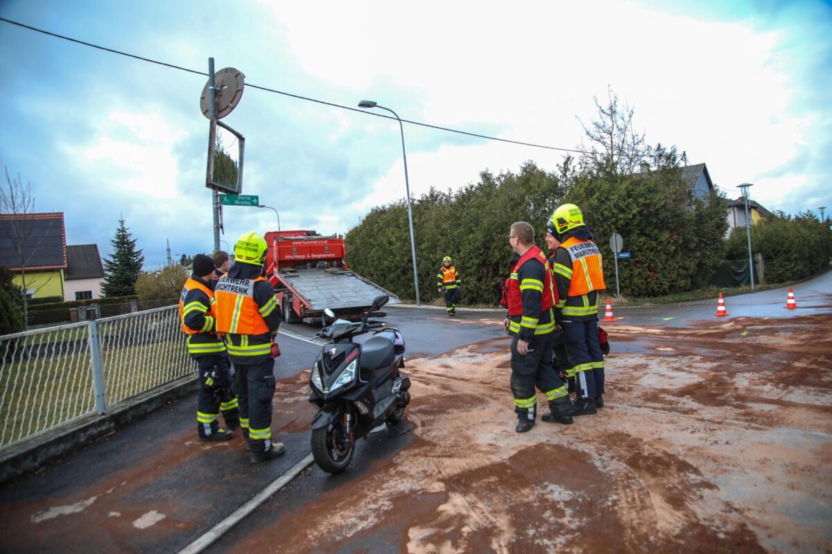 MARCHTRENK. Nach einem Zusammenstoß zwischen einem Auto und einem Moped auf einer Kreuzung in Marchtrenk ist am Donnerstagnachmittag eine größere Menge Treibstoff ausgelaufen.