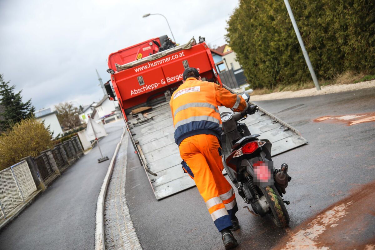 Der Unfall passierte auf der Kreuzung der Bahnhofstraße mit der Haidstraße und der Leharstraße. Aus dem Moped ist offenbar eine größere Menge Treibstoff ausgetreten, sodass umfangreiche Bindemaßnahmen durch die Feuerwehr erforderlich waren.