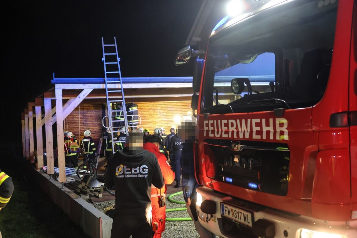 Das Feuer brannte im hinteren Abschnitt des Carports an der Fassade und in der dahinterliegenden Dämmung. Beim Eintreffen der ersten Einsatzkräfte waren bereits erste Löschversuche im Gange.