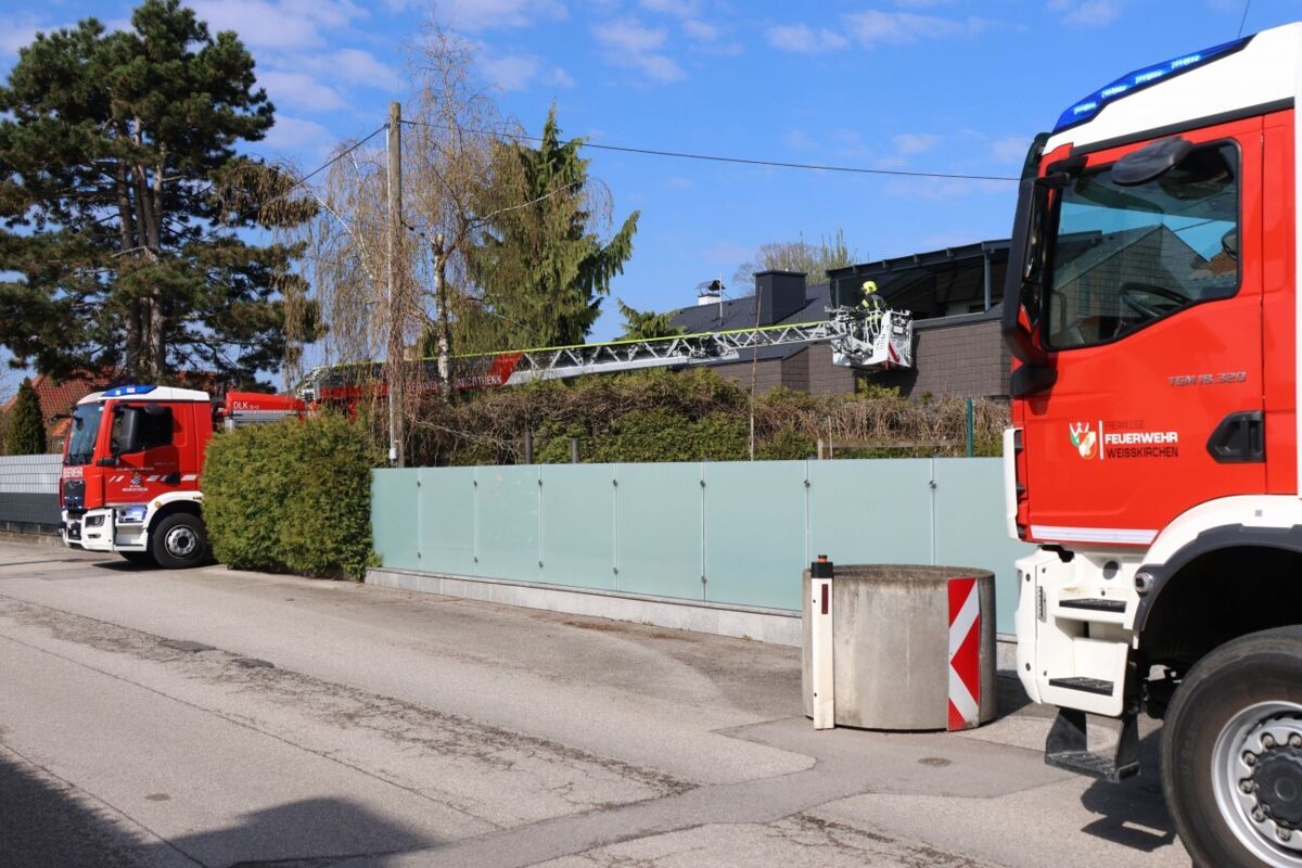 Person mit Drehleiter aus Wohnhaus in Weißkirchen an der Traun gerettet